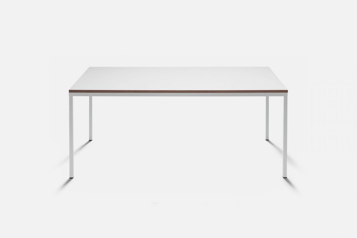 A thin white line defines this table that in many ways is a pioneer of a new approach to design. Graphic, minimalist, and essential, the top with marine plywood edge sits on the painted steel base. A versatile and adaptable dining table and work surface, it blends with any decor and setting. Functional but not too plain, it brilliantly solves the many challenges of life at home.