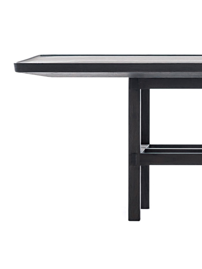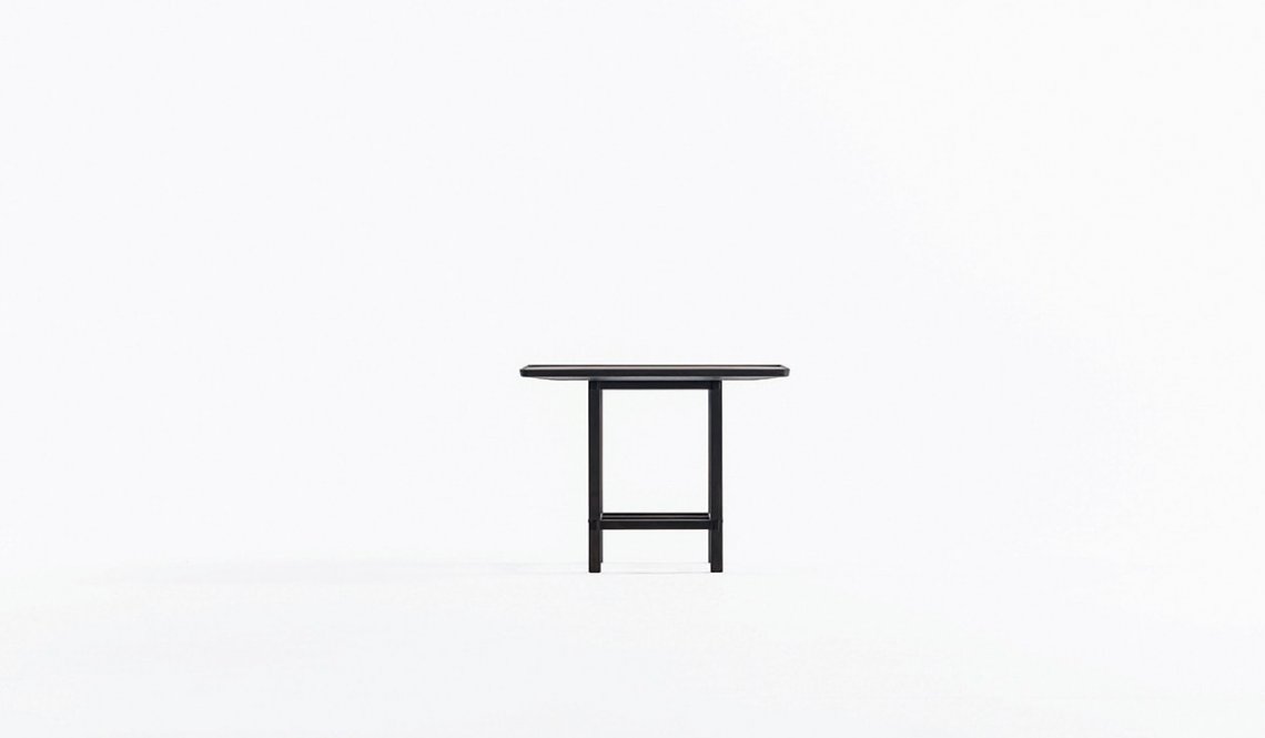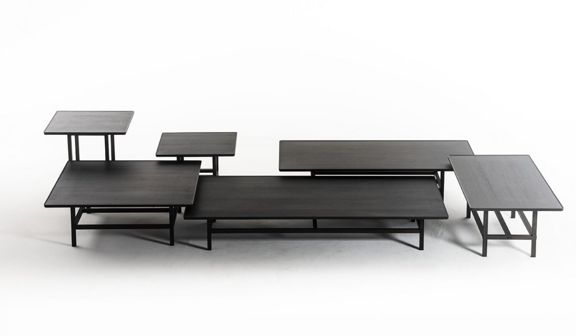 Classical Japanese architecture is the guiding thread for this series of tables with different heights, shapes and sizes. They interact with one other, creating real interior landscapes. The slender legs are stabilized by the artisan joinery of the horizontal elements intersecting at different heights to create eclectic, stackable combinations. Temple is available in bleached and charcoal gray oak wood.