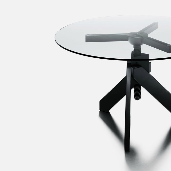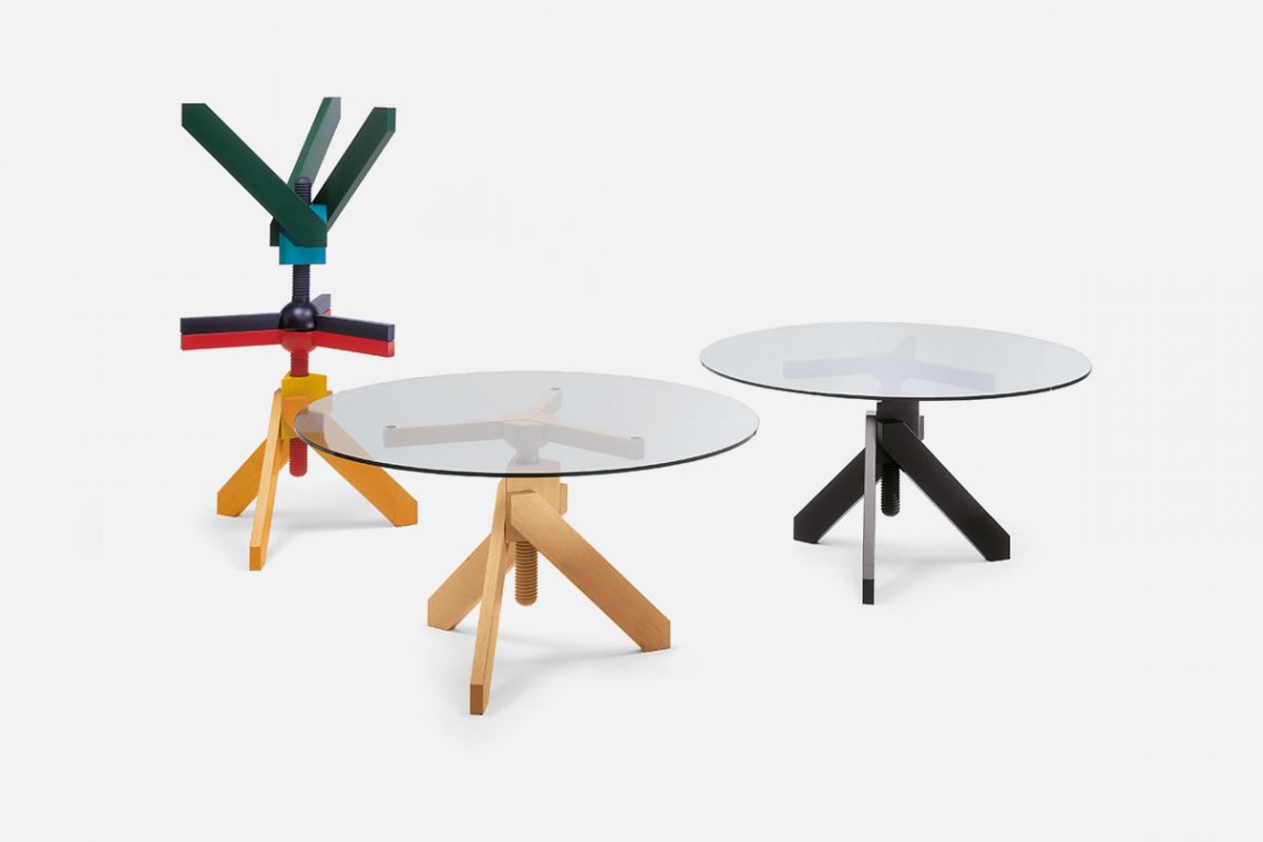 Inaugurating the De Padova table collection back in 1987, Vidun is still one of the most famous, recognized and admired projects by Vico Magistretti. A masterpiece of interlocking pieces that bring to mind a ‘vidun’, which means big screw in the Milanese dialect, it is made of natural, white or black beech wood in coordinated shades — purple with turquoise and green, red with yellow and duckbill orange — or black walnut. The sculptural and perfectionist glass top reveals the base.