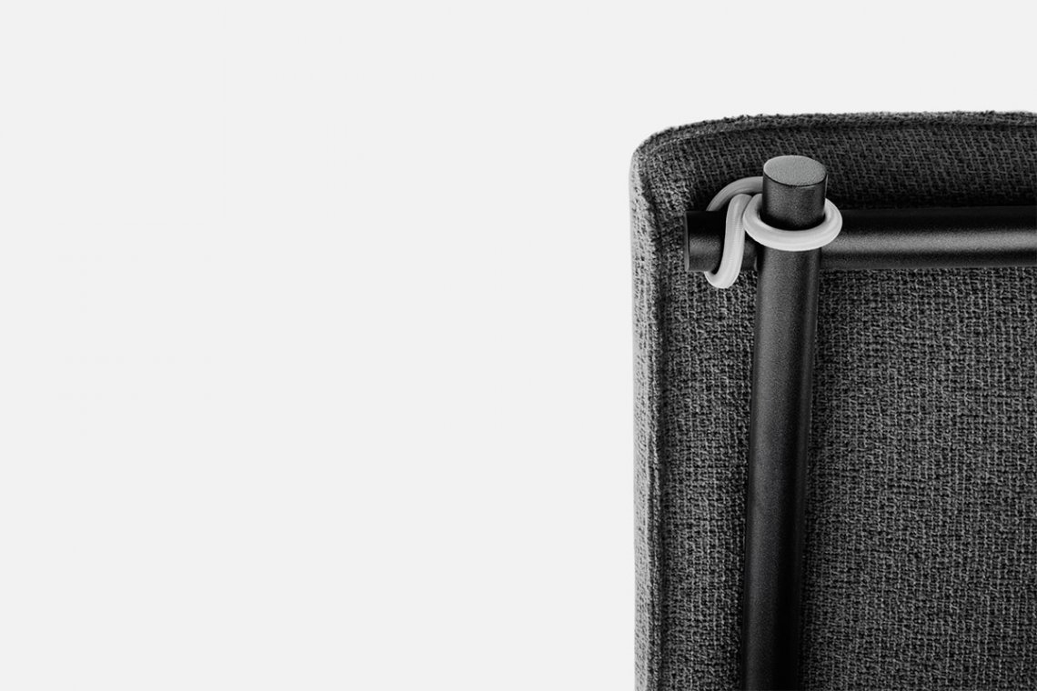 A gently curved and slightly open line defines Smeralda, the armchair designed by Anna von Schewen with a light retro look. The padded seat and back create a protected space. The matte anthracite gray painted steel structure is sleek and comes with contrasting elasticized cords. Solid and well-balanced, it is versatile and functional.