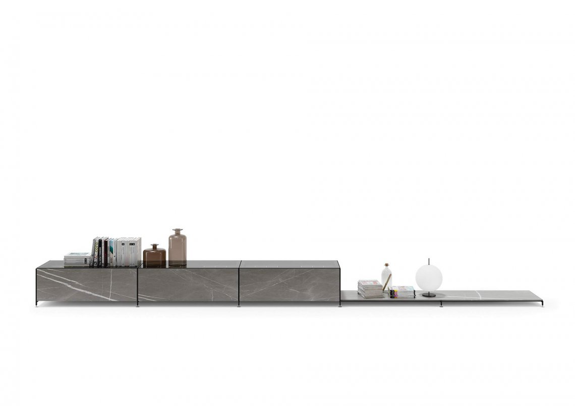 The modular R.I.G. shelving system is able to transform into any number of low profile furniture solutions suitable for the living room, study, entrance hall and dining room, including television stands, small tables for lighting, credenzas and low height bookcases.