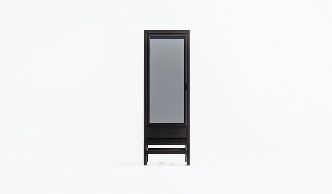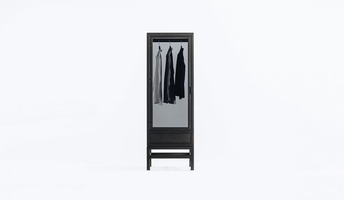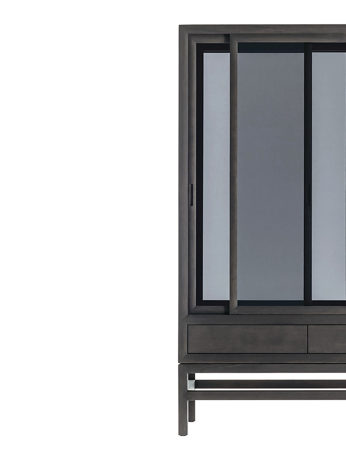 Sliding doors are an element that strongly characterizes traditional Japanese design. We find them in this contemporary double-door interpretation of the classic wardrobe, with drawers on the bottom for small objects and accessories. Also available in single version with hinged door, the wardrobe is made of solid bleached or charcoal gray oak wood.