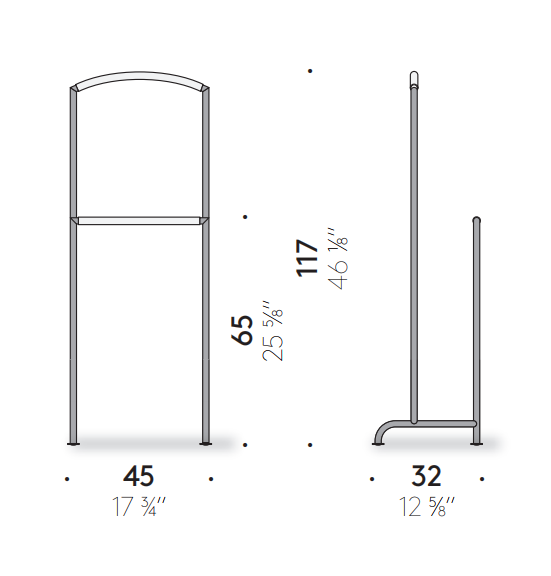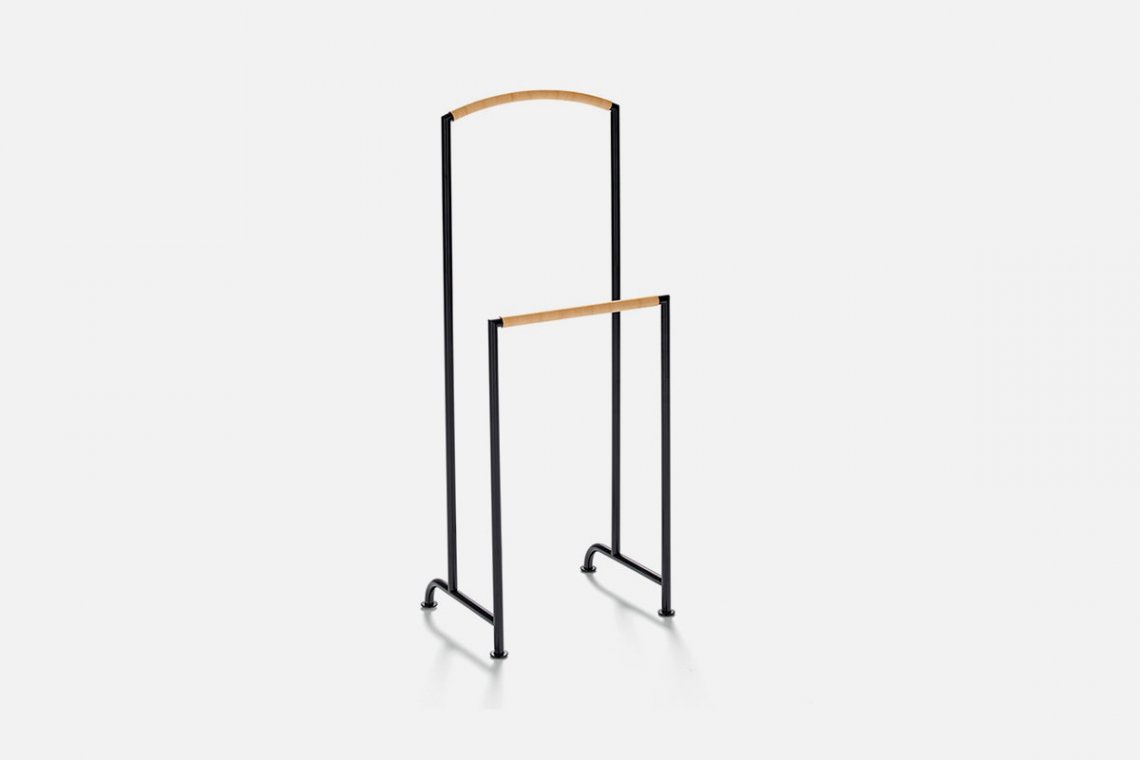 A contemporary version of a classic. The valet stand designed by Annette Lang is quite simple: black tubular steel covered with natural leather cord where clothes might slip. It’s perfect in the bedroom, where you need something practical for hanging things.