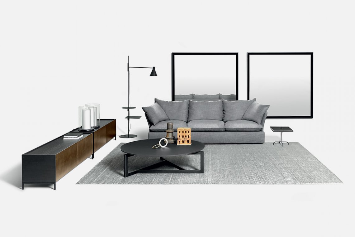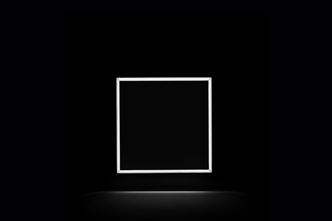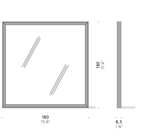 The narrow matte black frame surrounding the SP14 mirror has a square shape and beveled corners. The simple but not plain accessory chooses a corner of the home to frame and reflect ever-changing images.