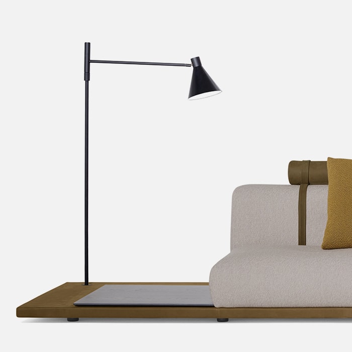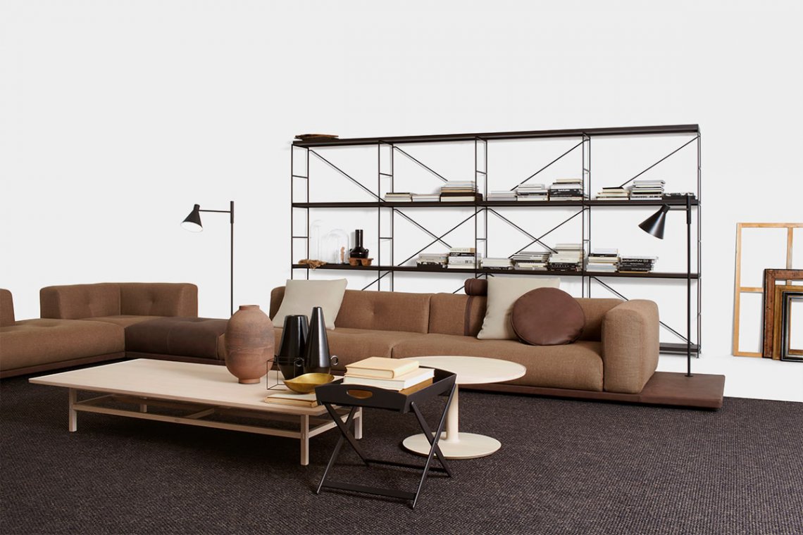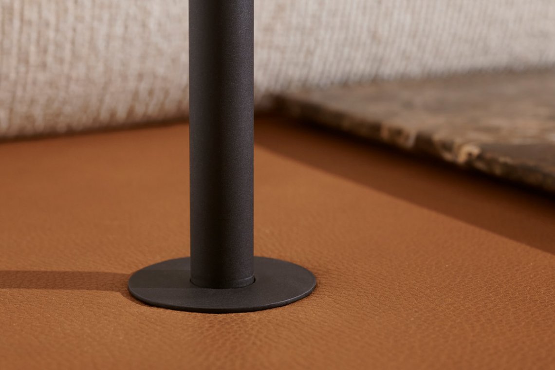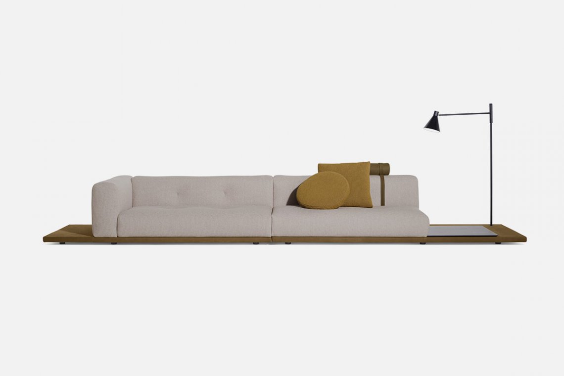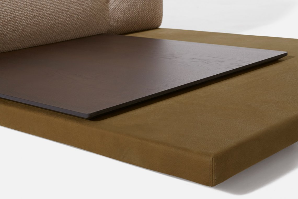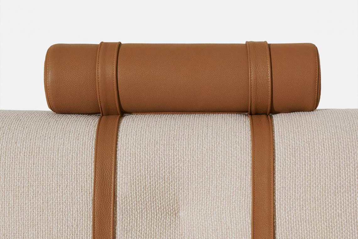 Elisa Ossino has created a new version of the Erei sofa, designing a variant that enhances the different configurations of the original concept. Erei Zone was conceived with a primary design purpose that combines sculptural values with the tactile evidence of extraordinary softness. A deconstructed shape that inspired a new, low model without feet, which rests directly on a platform covered in leather and thus, is even more versatile to use: one can rest small timber or marble shelves onto the base, or choose to add a Nota lamp. Backrests and seating are no longer separated into different sections, minimising the design to the essential. The materials selected for the padding are the result of research aimed at maximum comfort. Amongst the related accessories, a leather roll headrest is an alternative to the cushion, and a leather magazine bag can also store the remote controls.
