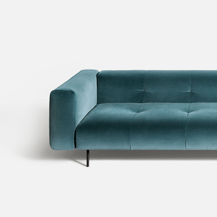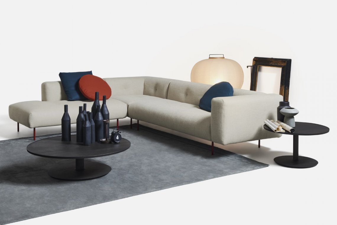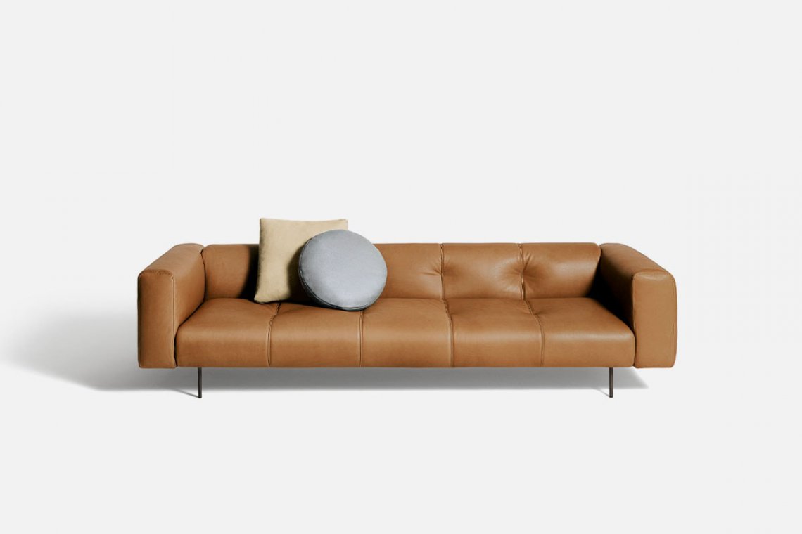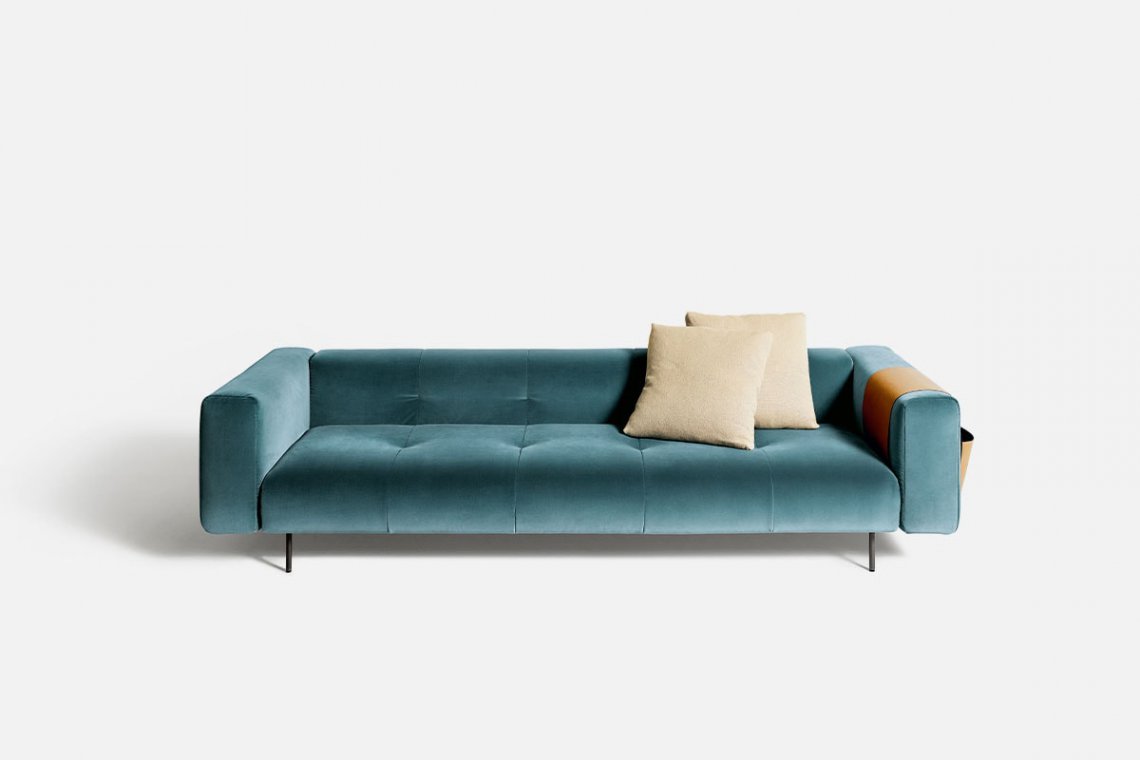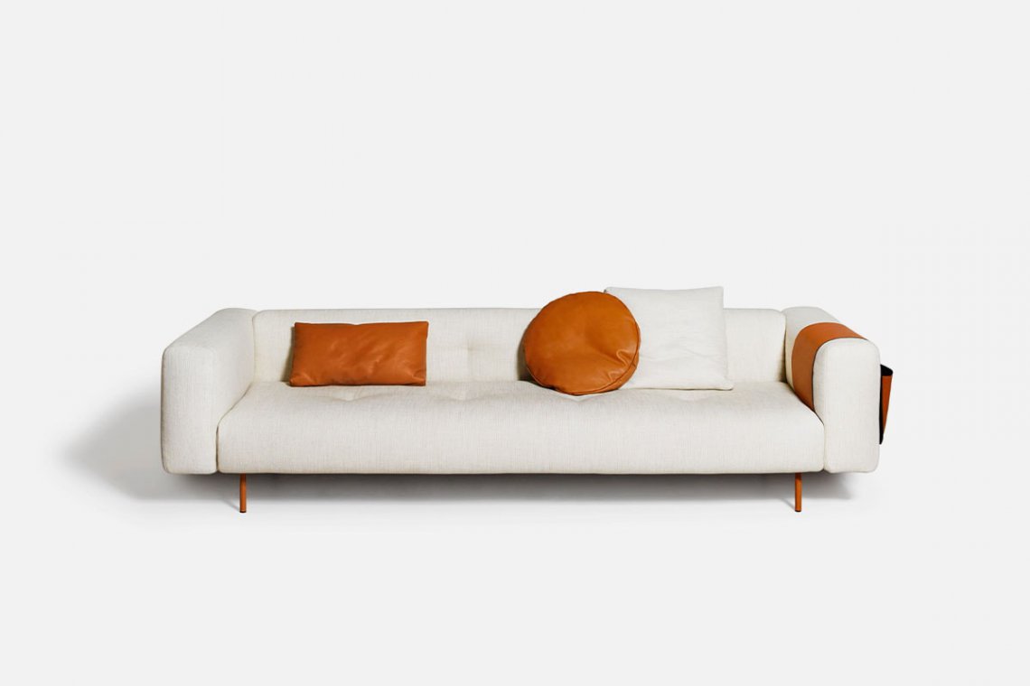 Like the Sicilian mountains after which it is named, Erei, the modular system by Elisa Ossino and a winner of the Archiproducts Design Award, lends itself to multiple compositions, also thanks to the option of inserting wood and leather side tables. The painted steel feet are slender and the compact seating features stitching that is an effective contemporary reinterpretation of the capitonné motif.