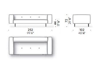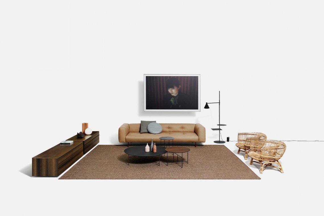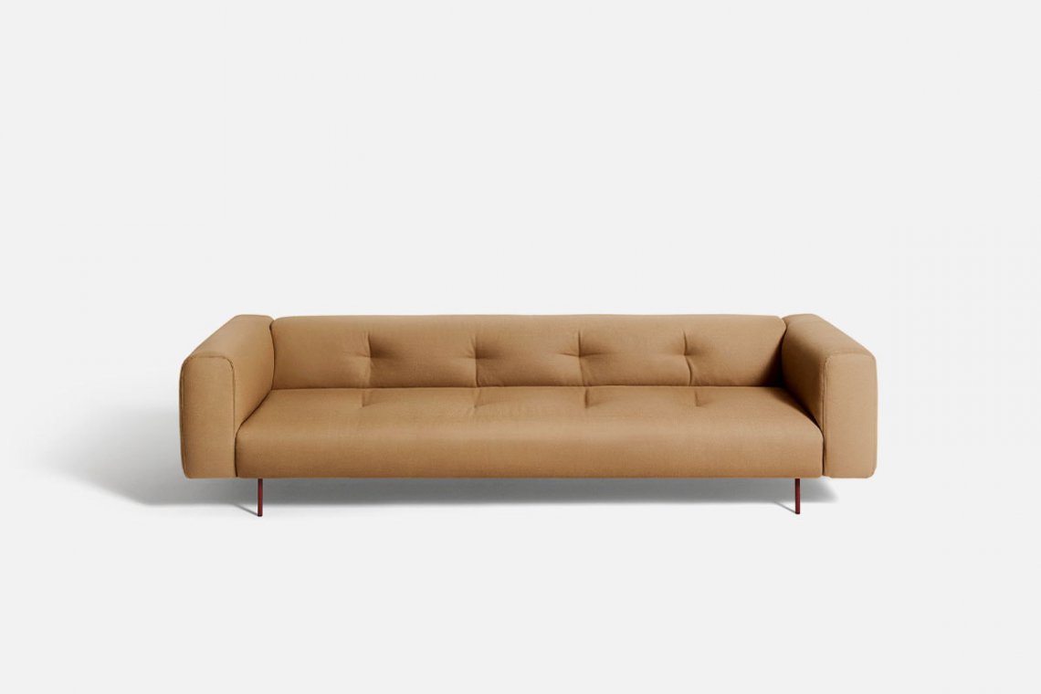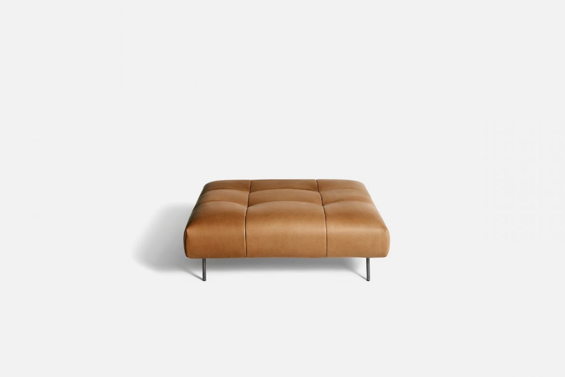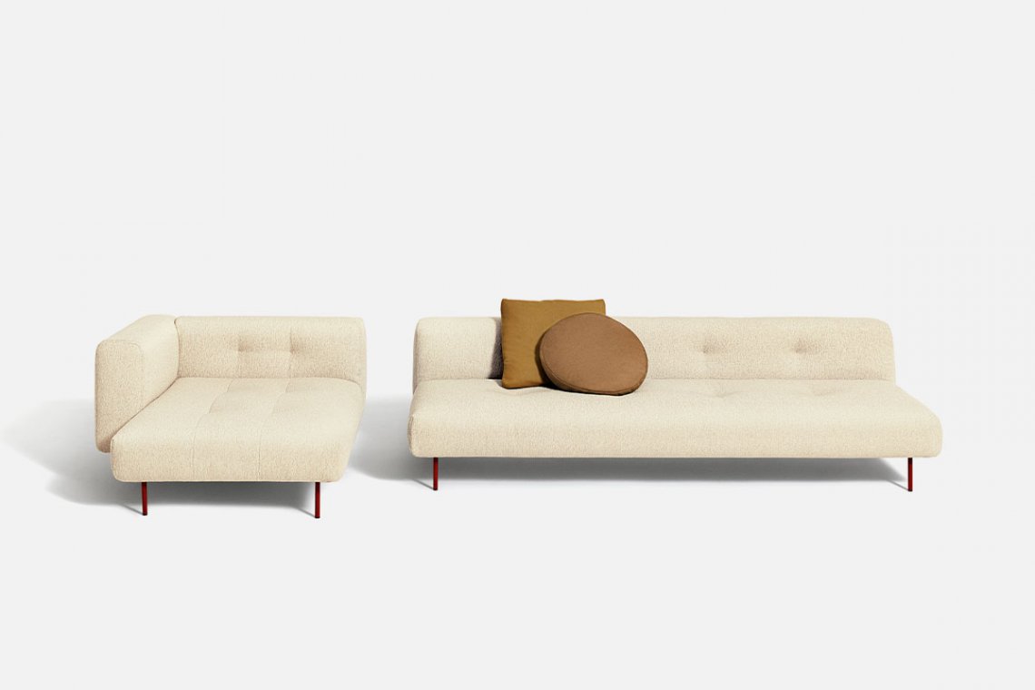 Like the Sicilian mountains after which it is named, Erei, the modular system by Elisa Ossino and a winner of the Archiproducts Design Award, lends itself to multiple compositions, also thanks to the option of inserting wood and leather side tables. The painted steel feet are slender and the compact seating features stitching that is an effective contemporary reinterpretation of the capitonné motif.