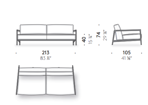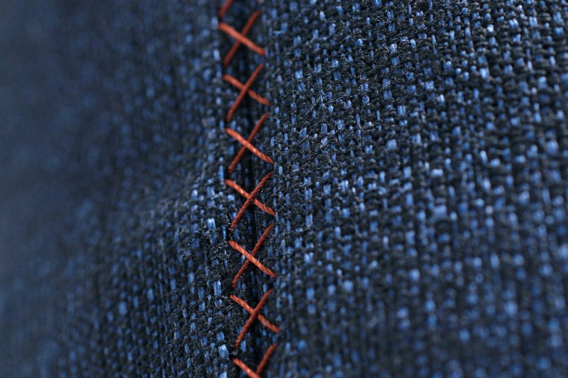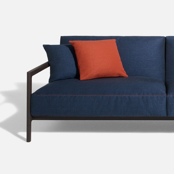 Sofas, armchairs and pouf are marked by contrasting stitching that evoke sartorial know-how.
