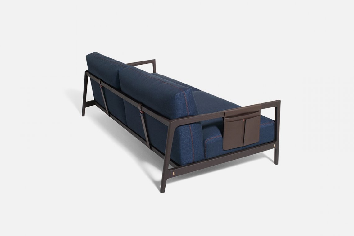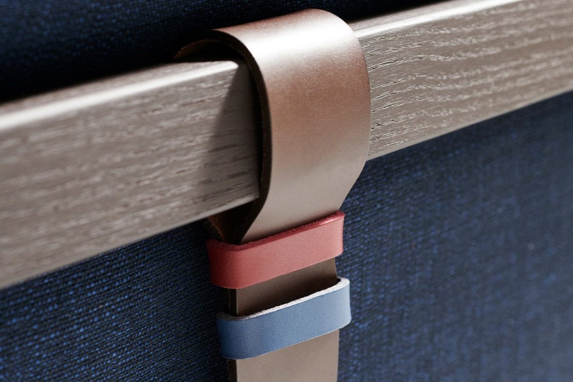 Leather straps, which bind to the structure to become an integral part of the design, are another key element, with minutely coloured details. Functional leather pockets are also hooked onto the finely rounded armrest with its pleasurable ergonomics and tactility.