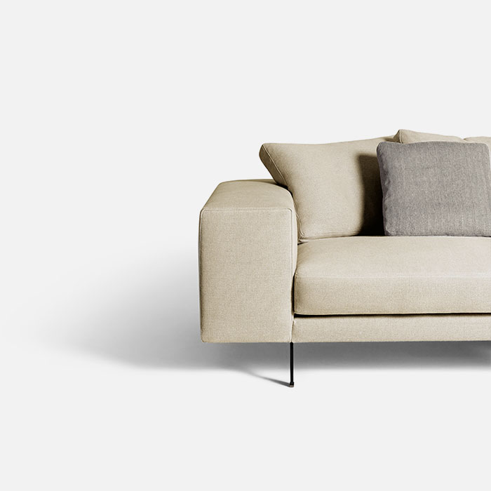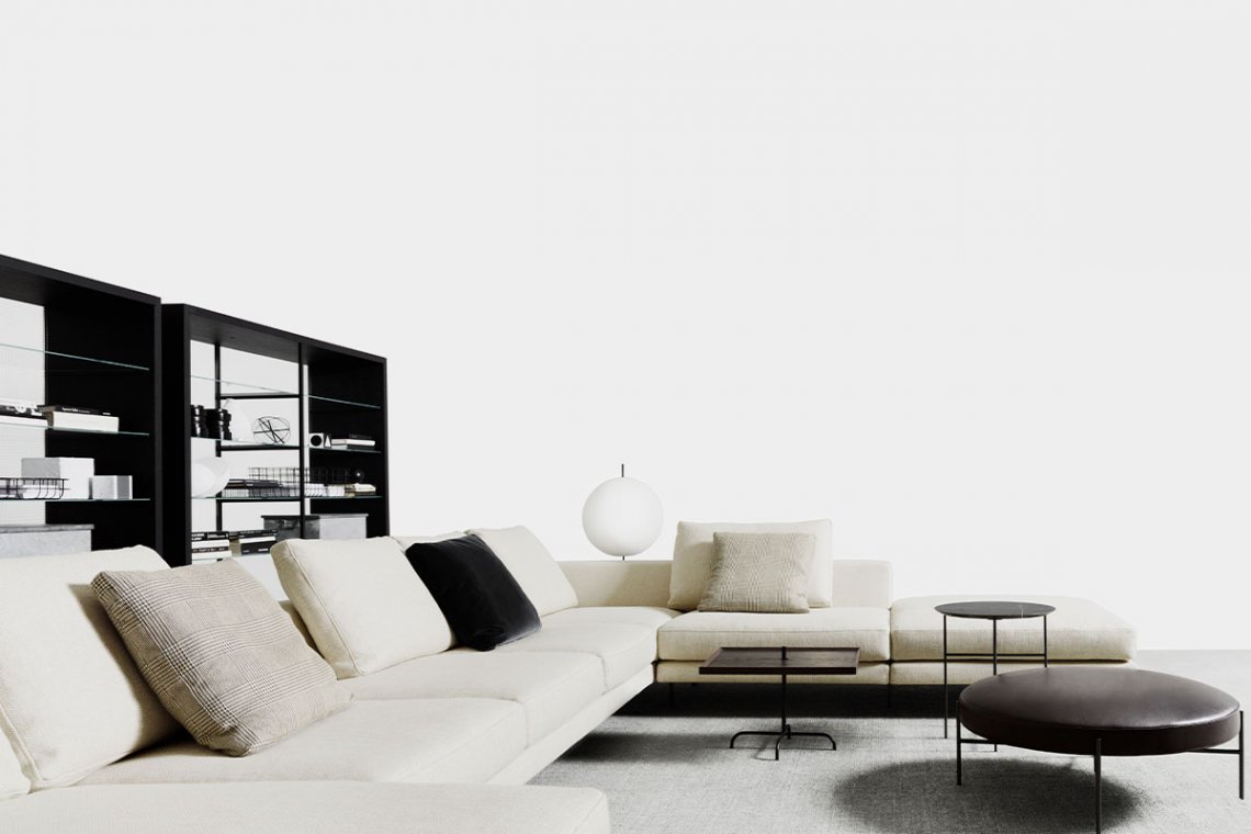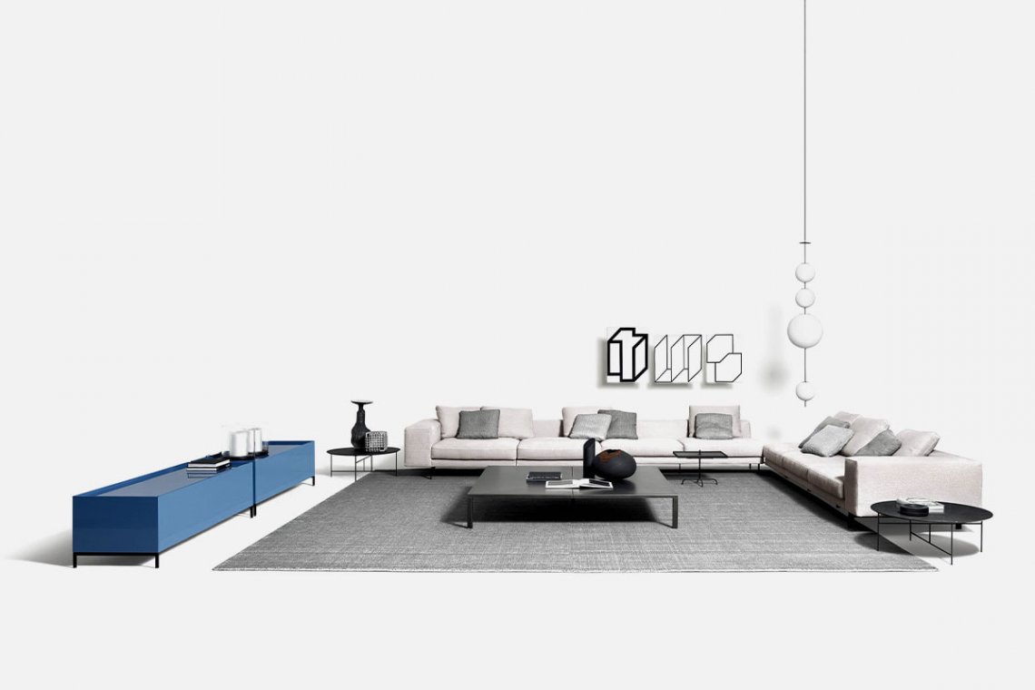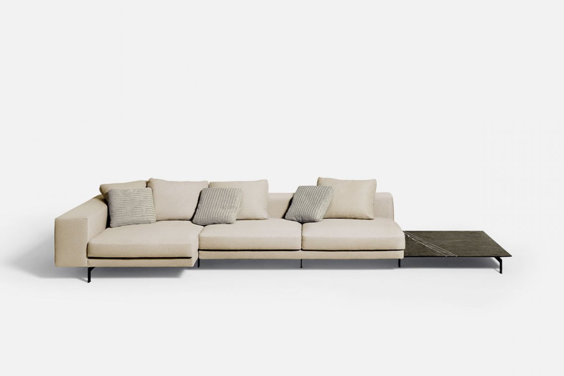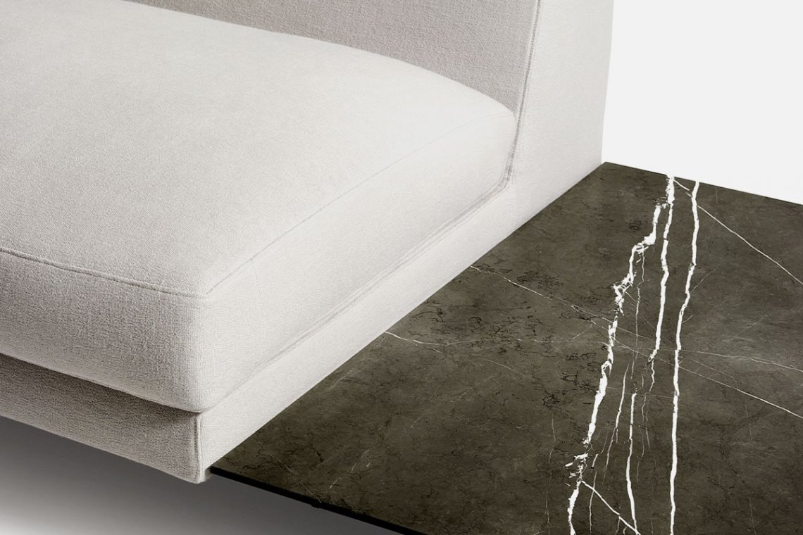 New lines reinterpret the Flying version of the Landscape sofa with the same square silhouette but a thinner seat, lighter frame and higher feet. This novel version is compatible with a series of wood and marble tables, which are perfect when placed next to the sofa in an intermediate, corner or end position or used as a free-standing piece. These new shapes are completed by goose down cushions and pouf that create a welcoming, convivial space.