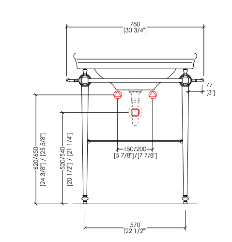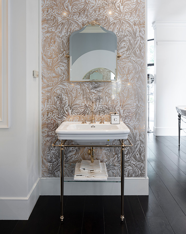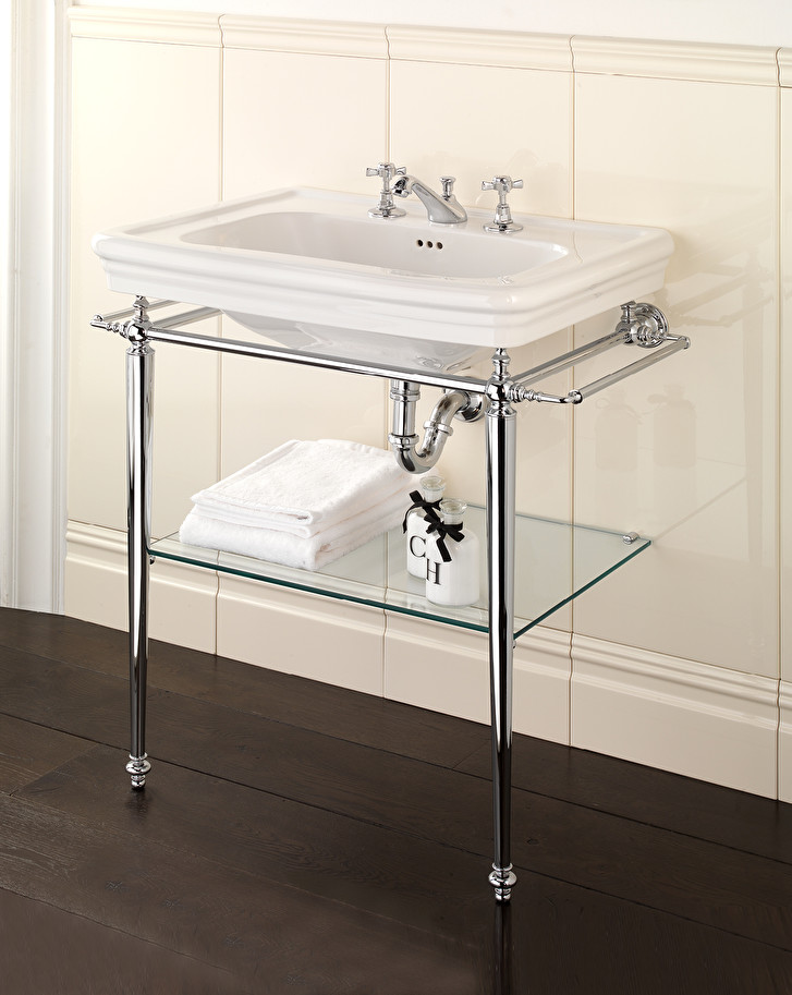 The quintessence of the classic style, conceived for the needs of space and practicality of the contemporary living. The refined English porcelain washbasin and the large glass shelf are supported by a turned brass structure, available in chrome, polished nickel or light gold finishes.