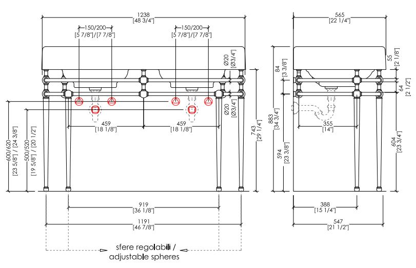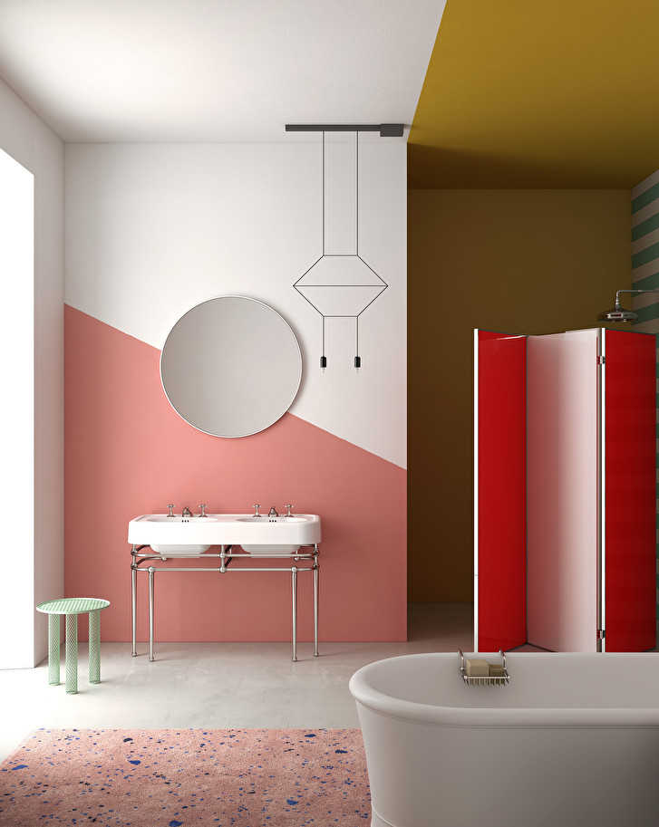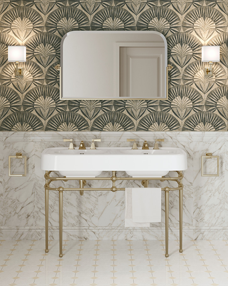 Memphis, a large console characterized by a double sink unit, is inspired by the lively urban atmosphere of the early American twentieth-century. The single ceramic piece contains two large oval basins. The bearing structure consists of tubular turned brass elements, available in chrome, light gold, polished or white nickel finishes.
