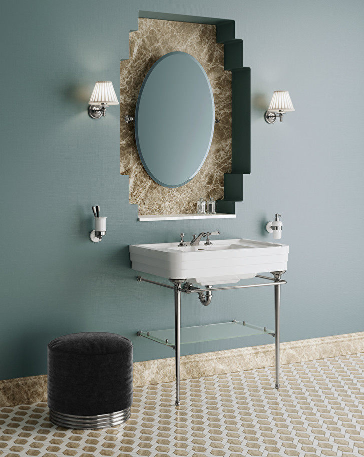 An elegant console that takes the essential beauty of Art Déco architecture and reinterprets this with a focus on the most exclusive comfort. The brass frame has a moulded base sculpted into three sections that evoke the sculptural shape of the ceramic washbasin, and includes three towel rails and a glass shelf. With a bespoke choice of finishes.