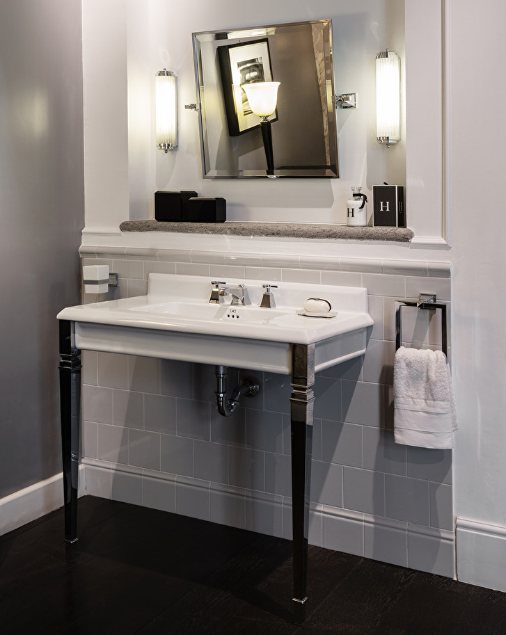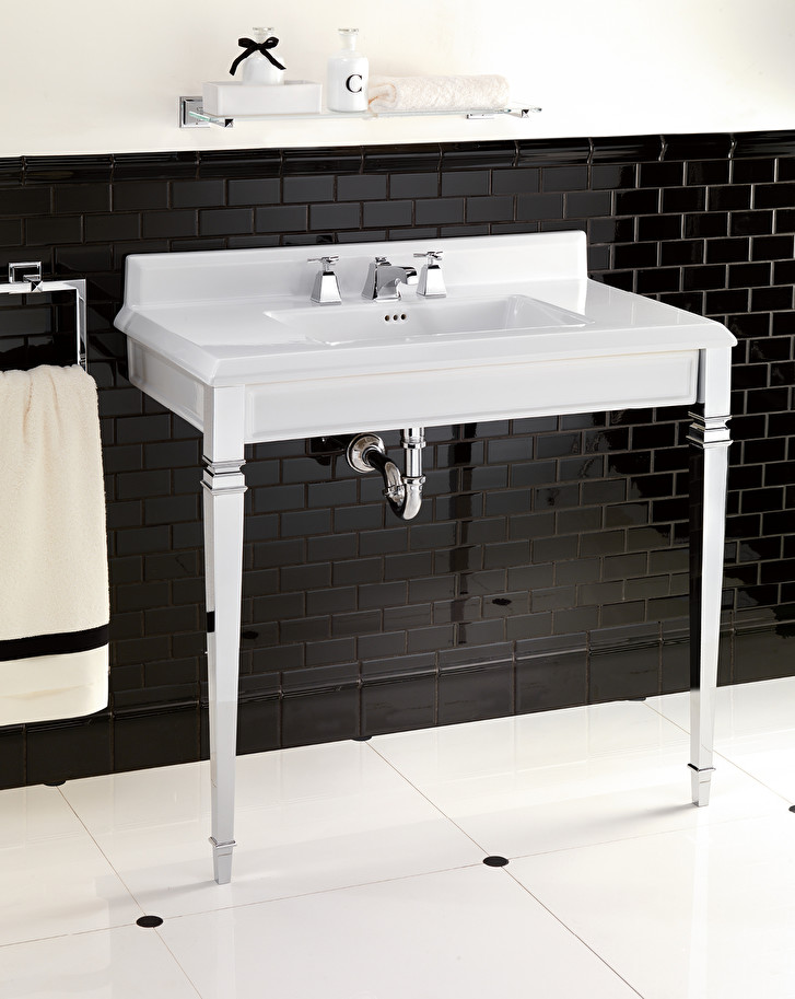 The timeless charm of the old marble consoles is reinterpreted for practicality in this elegant white ceramic version; it is equipped with aluminium pyramid-shaped legs inspired by the Art Deco style, available in chrome, light gold or polished nickel finishes.