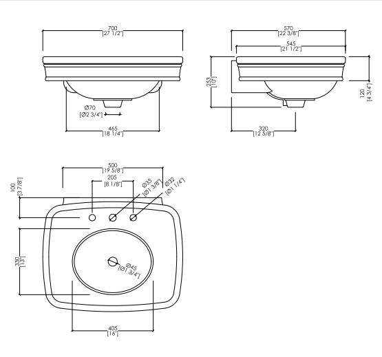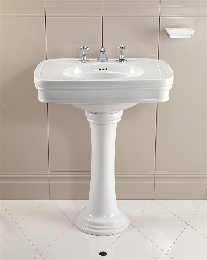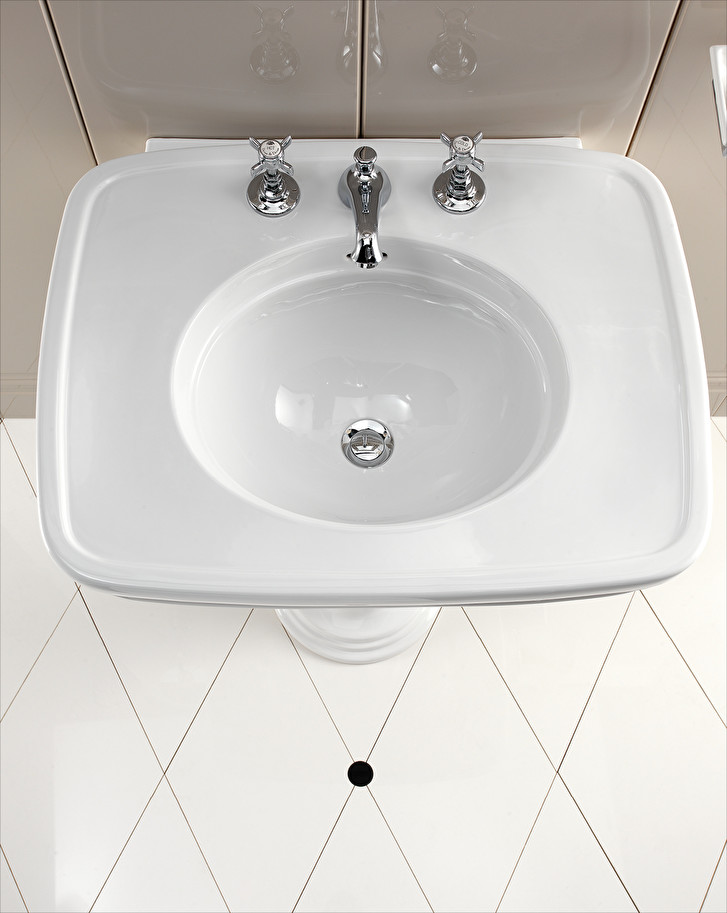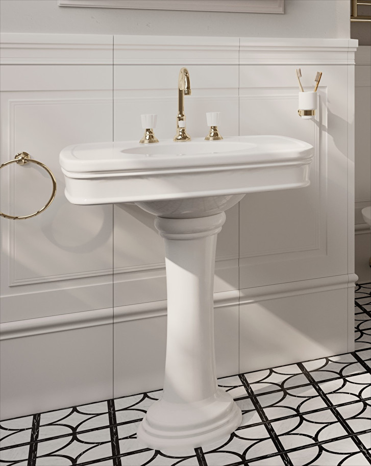 Classic lines and 1950s inspiration for a washbasin with pedestal in fine white porcelain, which combines bon ton taste with functionality in a perfect mixture. It is available in the versions with 1, 2 and 3 hole.