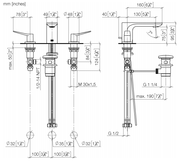 Three-hole basin mixer with pop-up waste