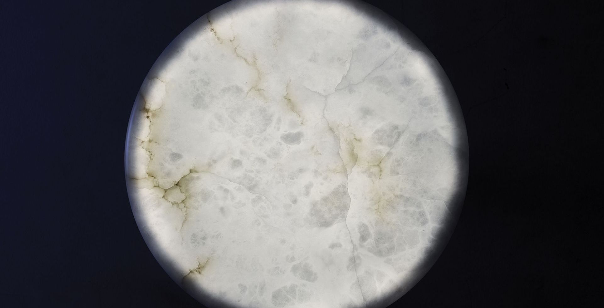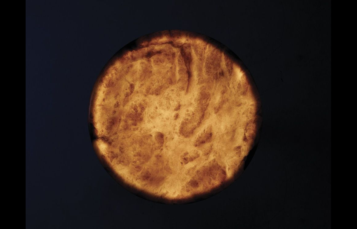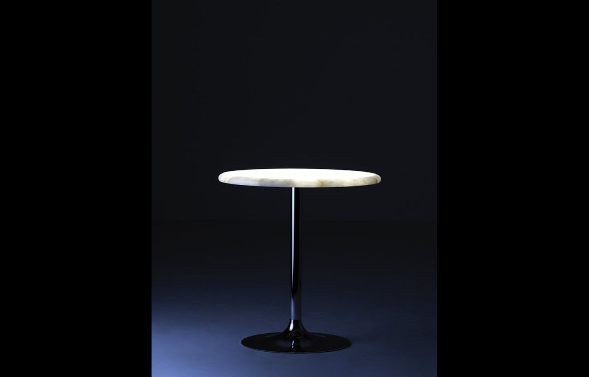 A table in alabaster obtained by cutting a very thick slice out of the egg-shaped extremely pure matter lit from within.