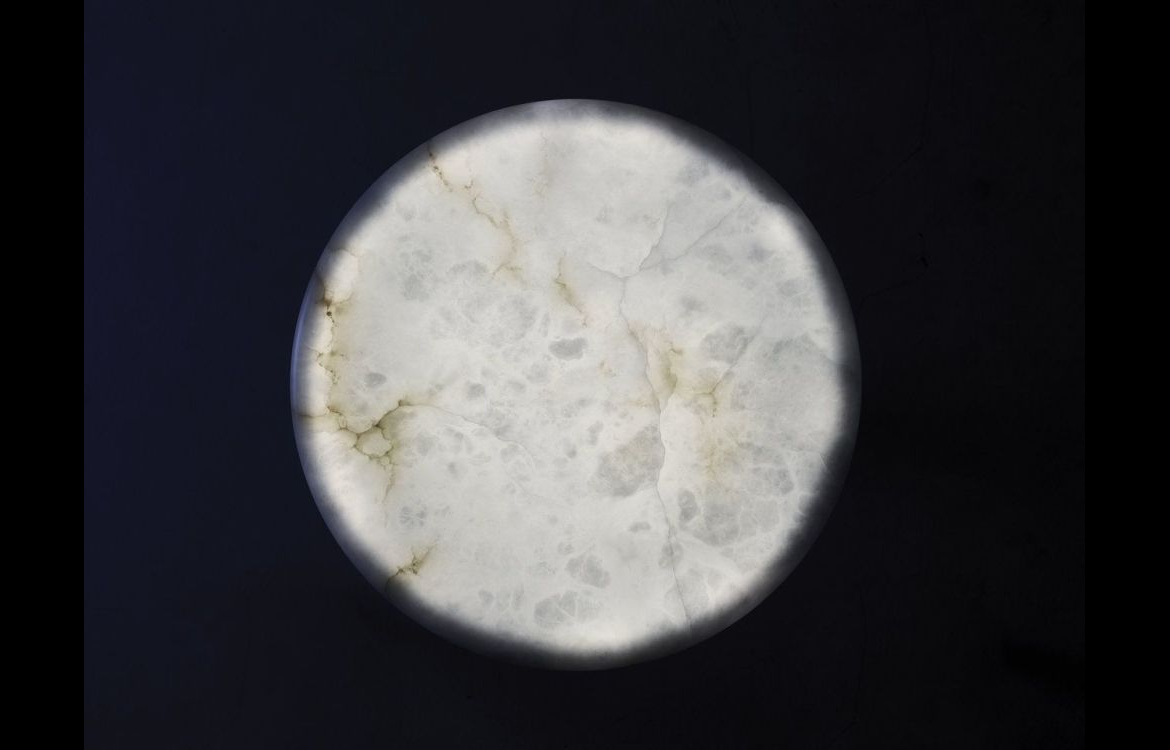 The translucent stone is supported by a shiny metal pedestal and, illuminated, it recalls the full moon.