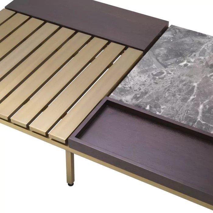 Brushed brass finish | grey marble | brown oak veneer