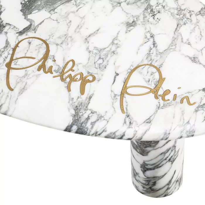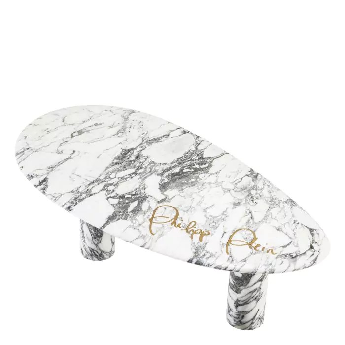 With its voluptuous curved organic form, the Forte coffee table has been carved from white Cararra marble by master craftsmen and finished with the dynamic Philipp Plein signature in gold.