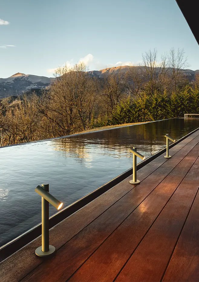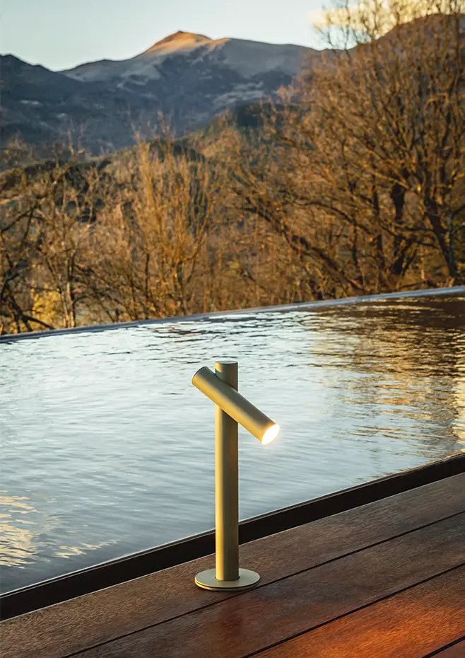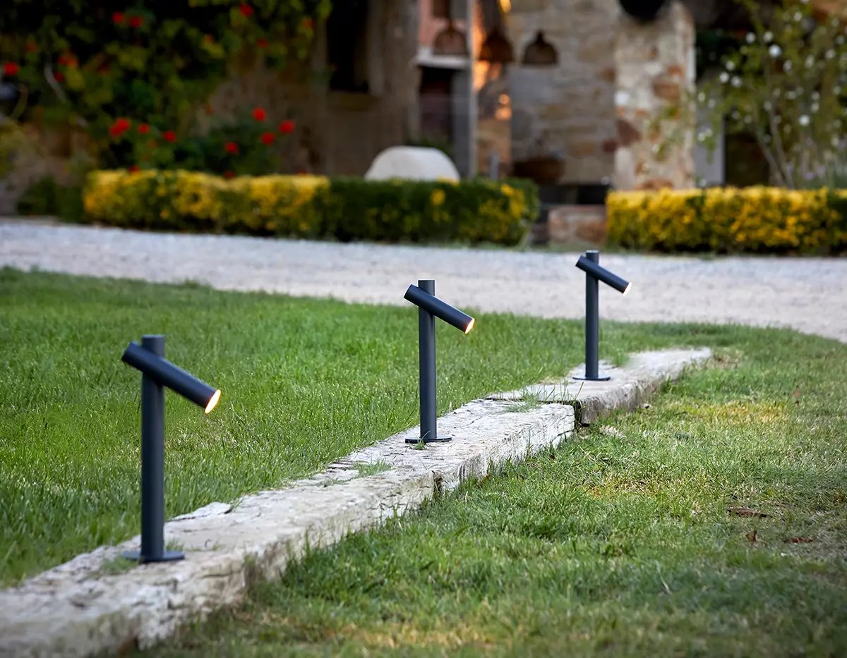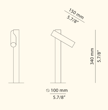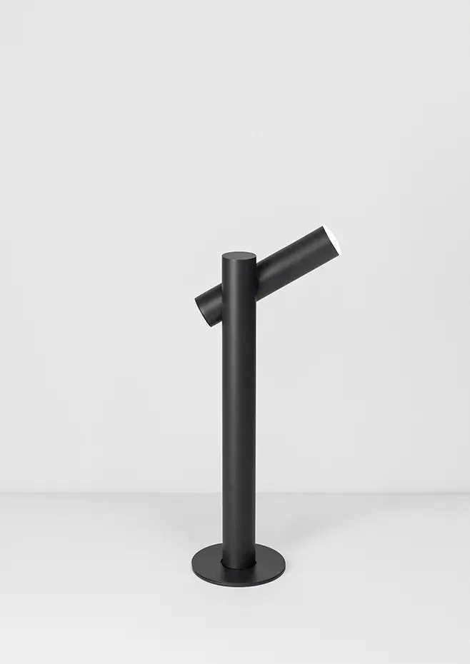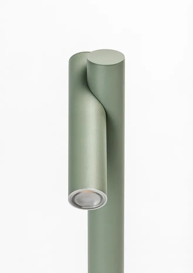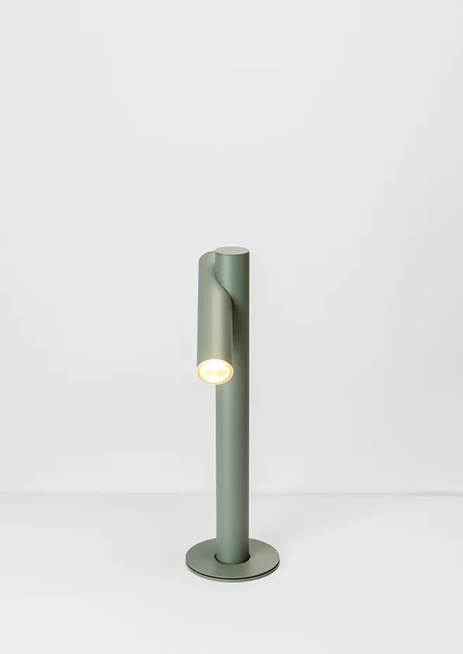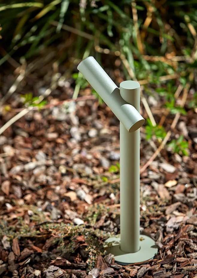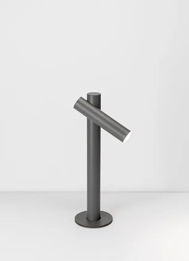 Metallic outdoor bollard light. Integral LED providing direct light.