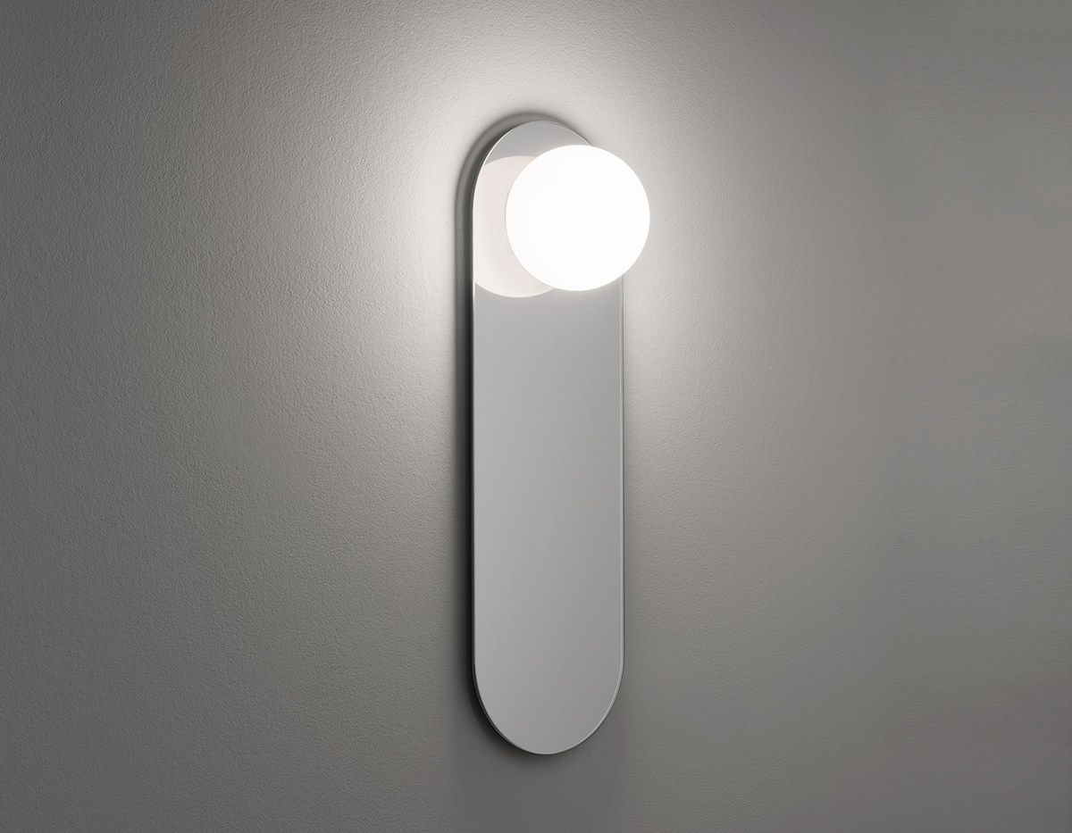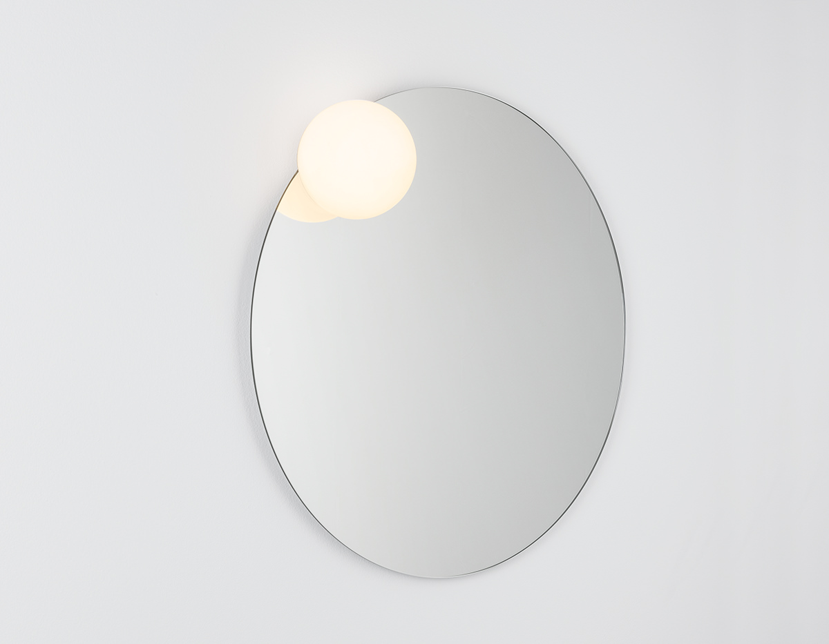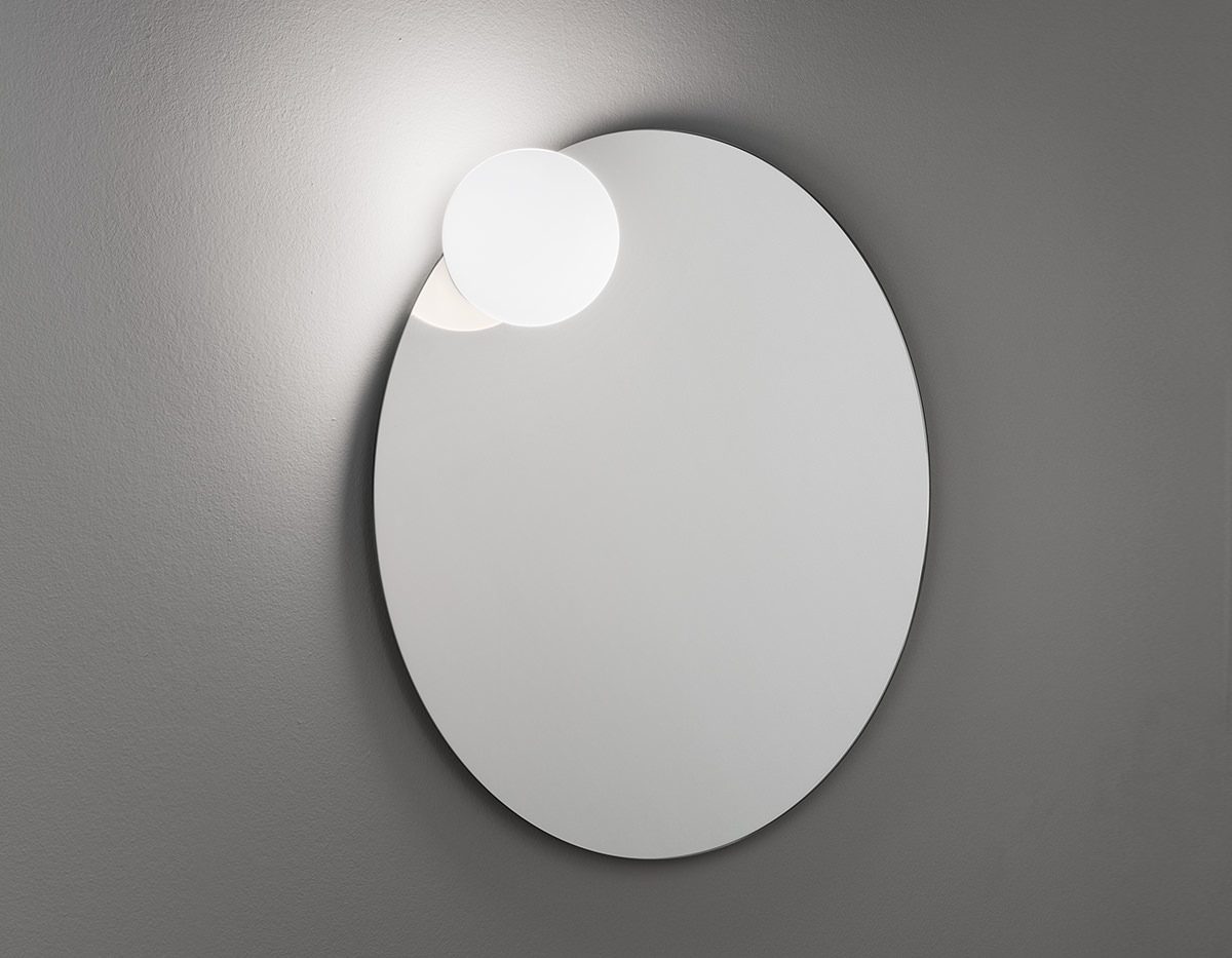 Illuminated decorative mirror with glass shade and integrated dimmable LED.