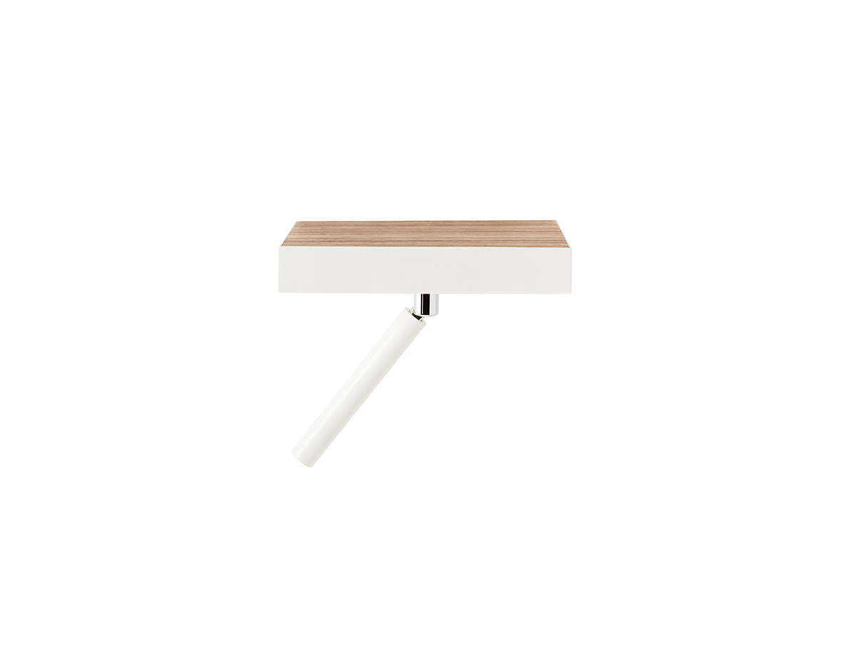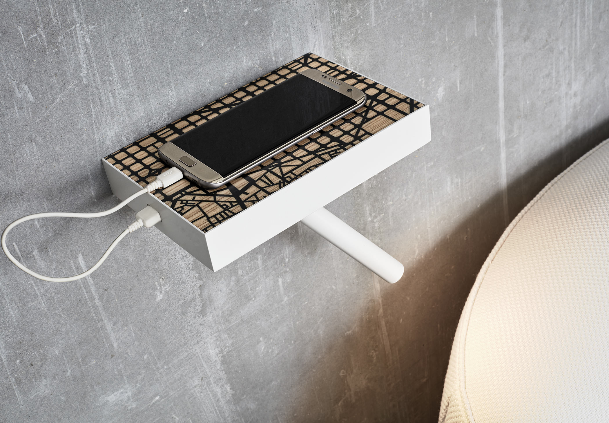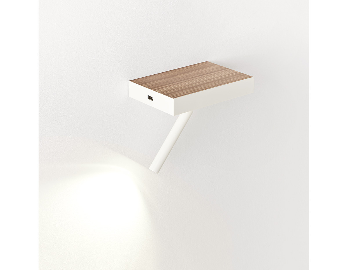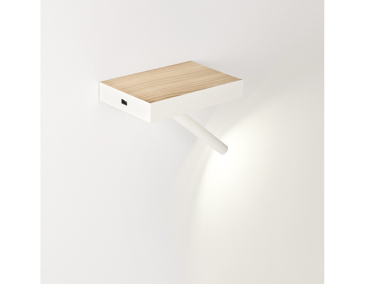 Metallic reading wall lamp with a wooden shelf and a 2 Amp USB charger. Adjustable reading arm with integrated LED and on/off switch on the bottom of the shelf.