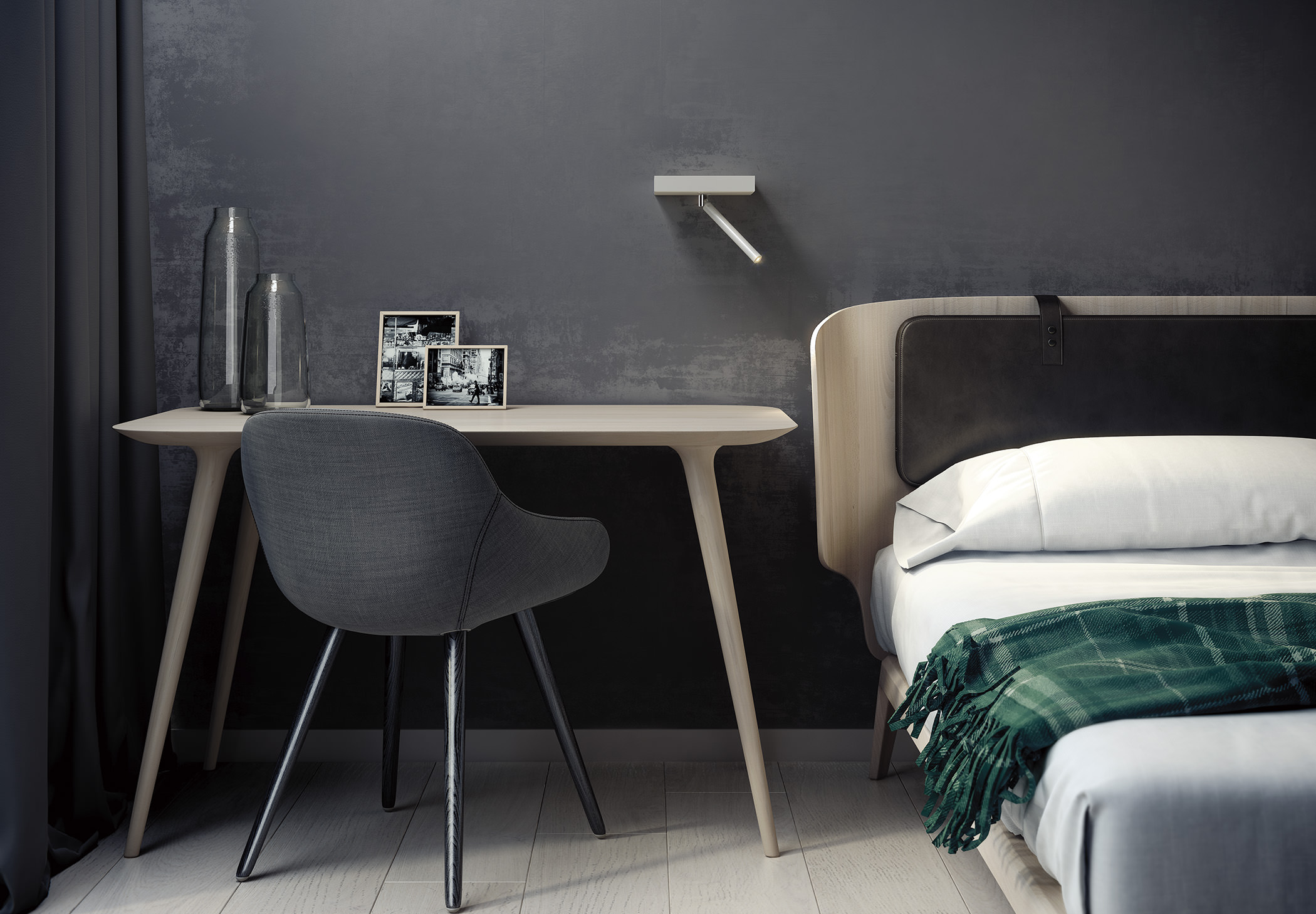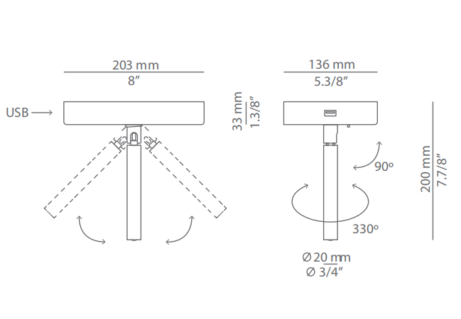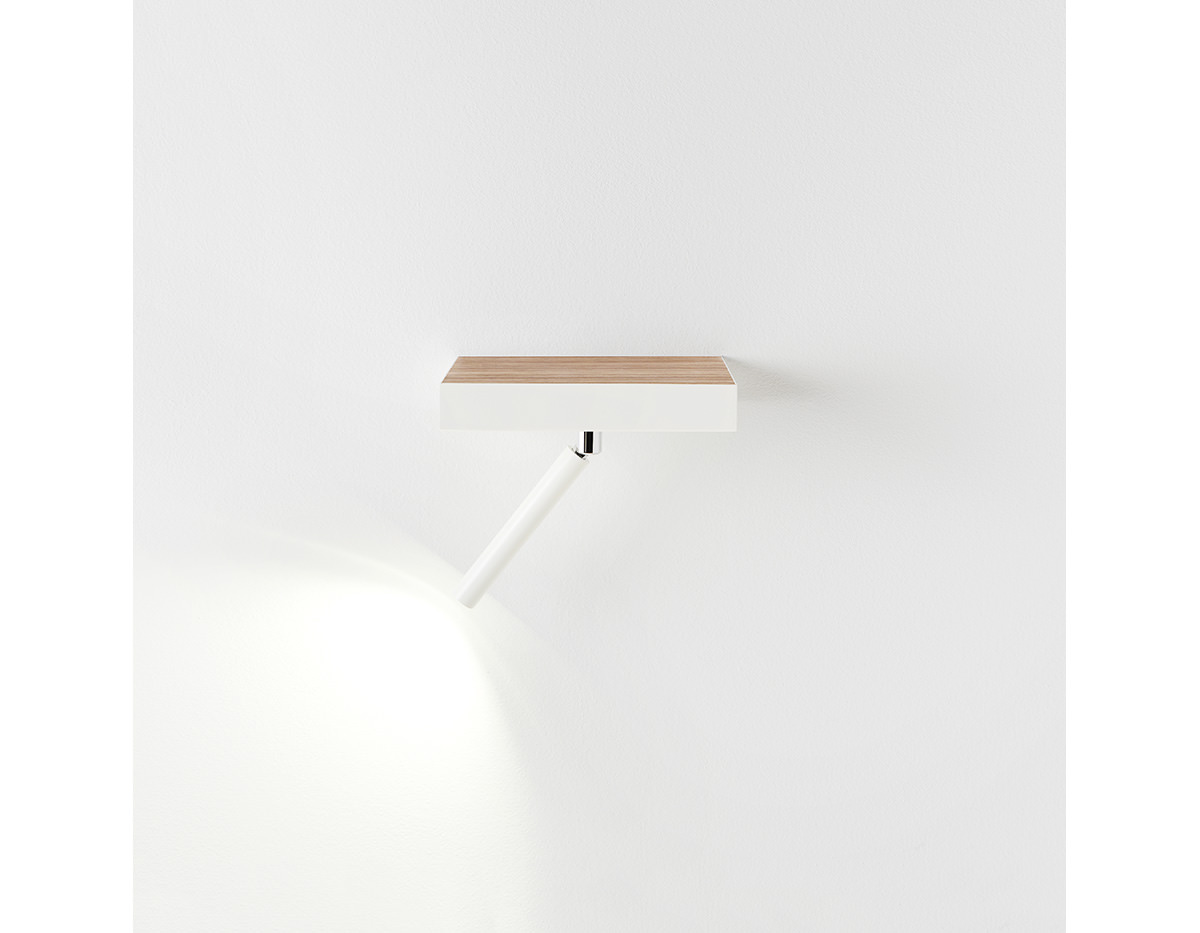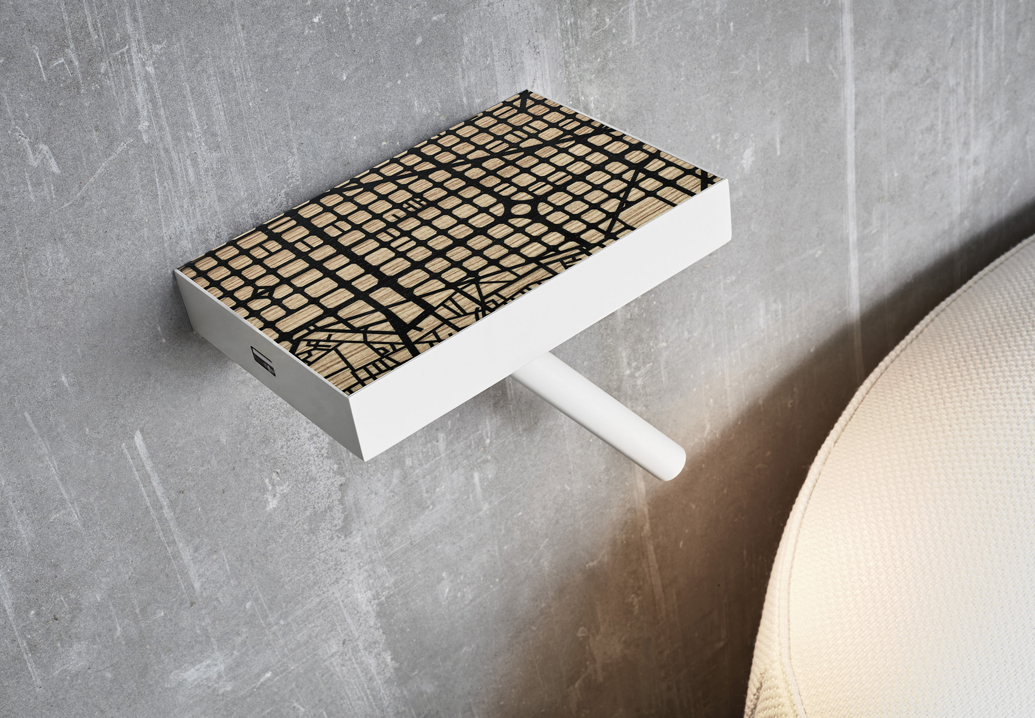 Metallic reading wall lamp with a wooden shelf and a 2 Amp USB charger. Adjustable reading arm with integrated LED and on/off switch on the bottom of the shelf.