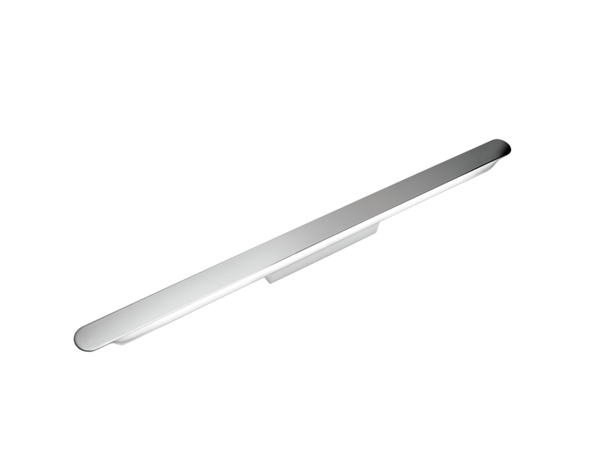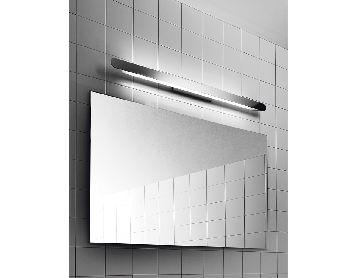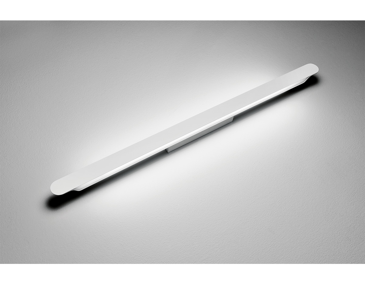 Metallic wall lamp with indirect fluorescent light, compatible with LED bulbs. It can be mounted vertically or horizontally. The front plate allows laser-cut signage with custom creations including ideograms, logos and texts.