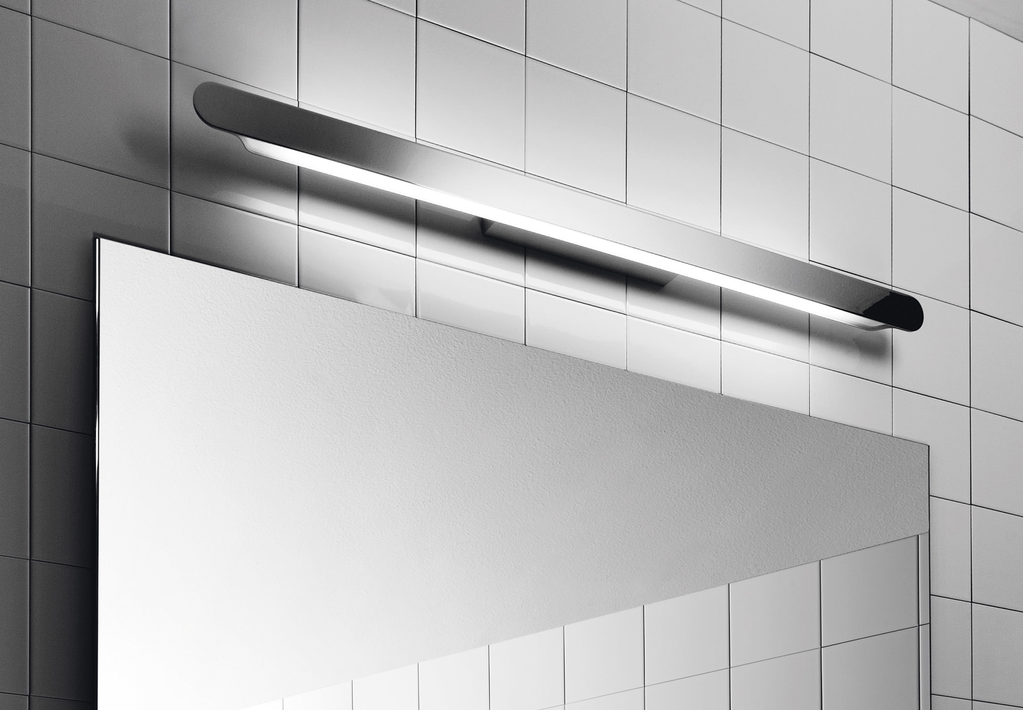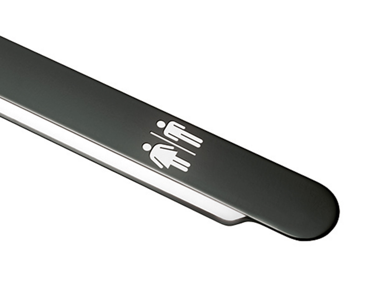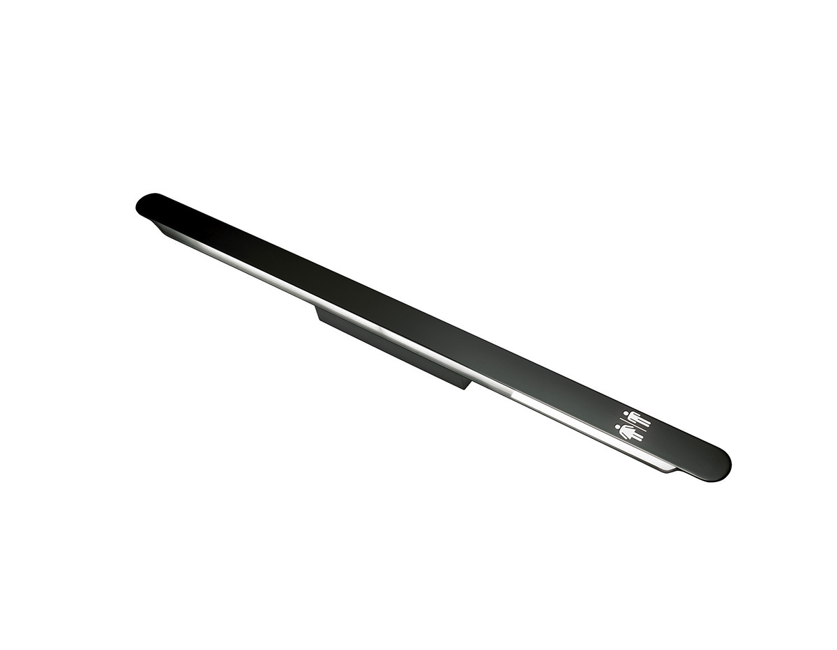 Metallic wall lamp with indirect fluorescent light, compatible with LED bulbs. It can be mounted vertically or horizontally. The front plate allows laser-cut signage with custom creations including ideograms, logos and texts.