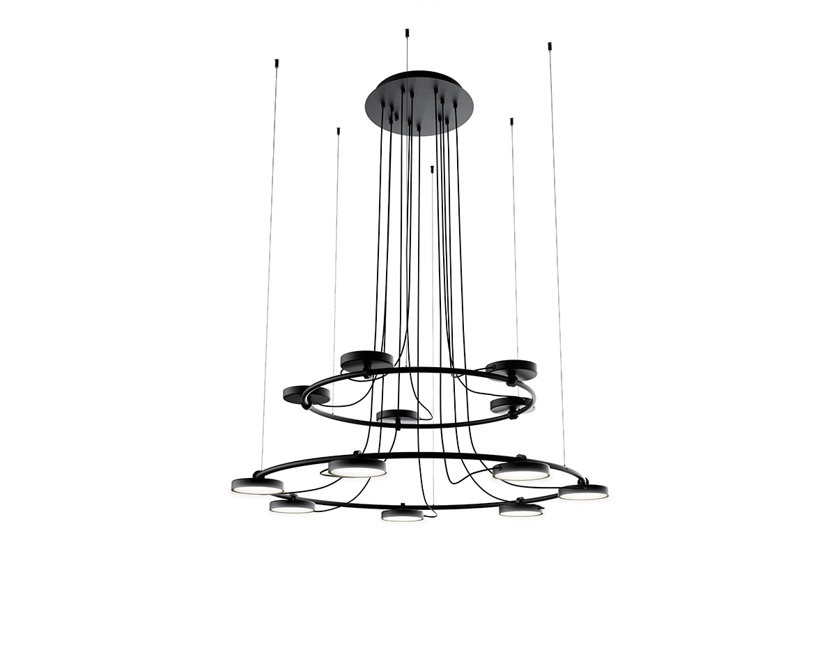 Metallic suspension lamp with circular adjustable heads and acrylic diffusers. The heads rotate up to 106o. The lamp can be mounted with all heads facing up or all heads facing down. Adjustable height and integrated LED dimmable 0-10V. In the composition R40.1M1L each lamp is dimmable independently and each one can be mounted with heads facing up or down.
