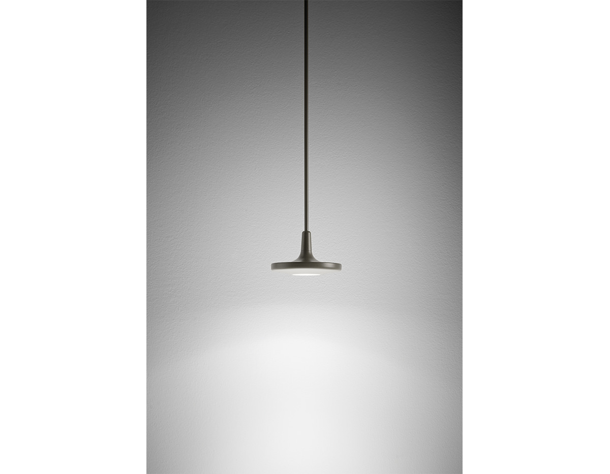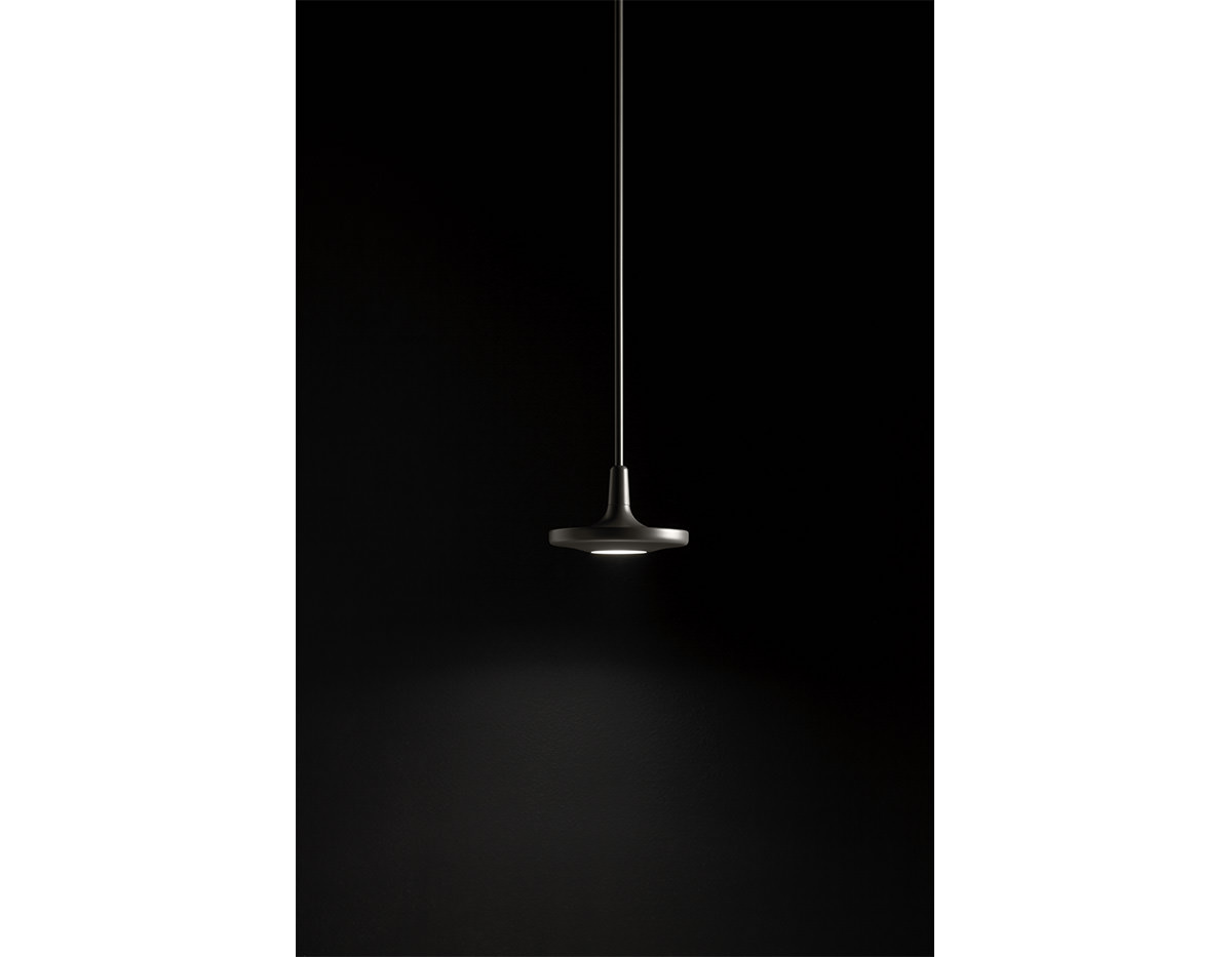 Metallic suspension lamp with aluminium shade and integrated dimmable LED. Adjustable height and individual canopy, suitable for creating compositions.
