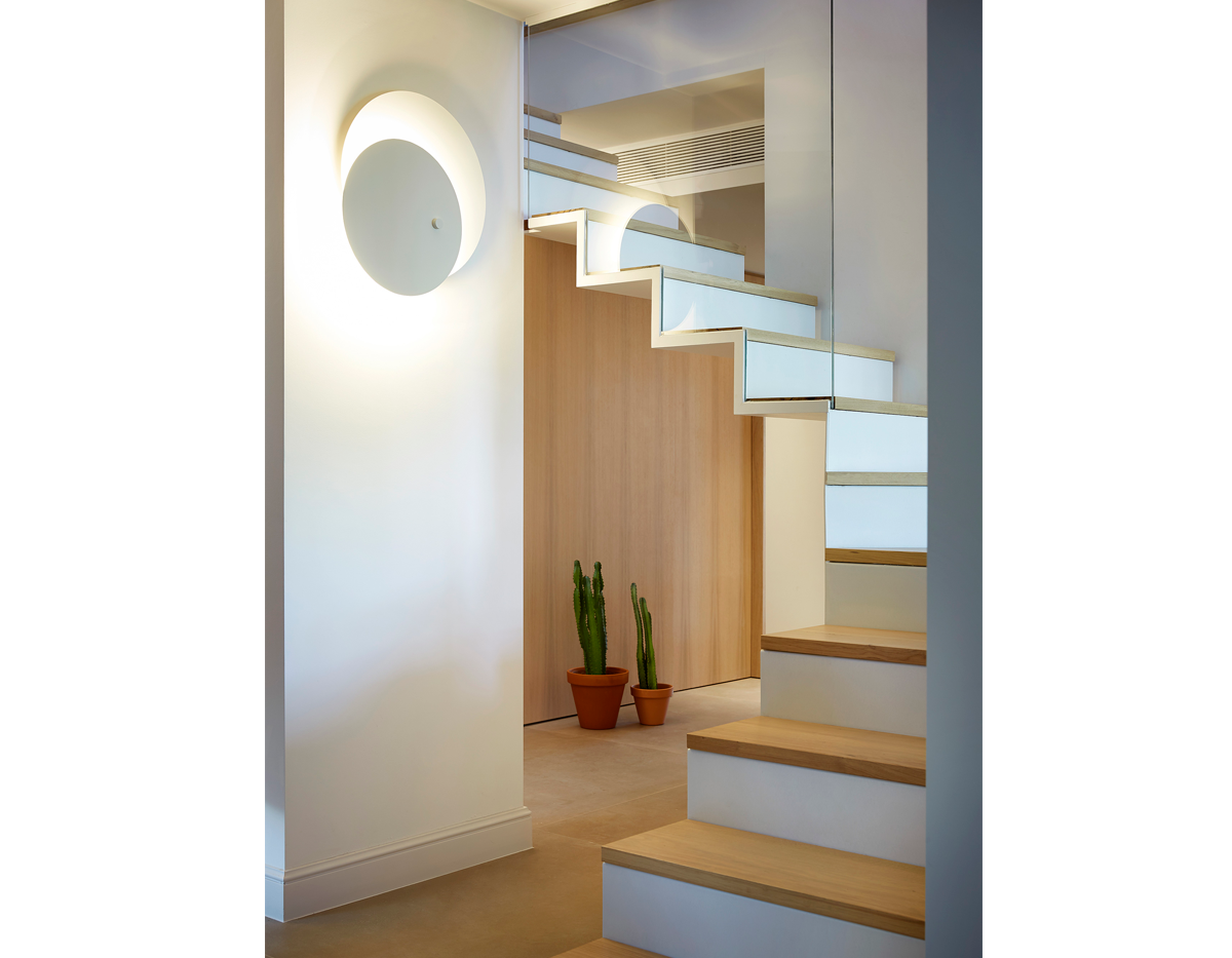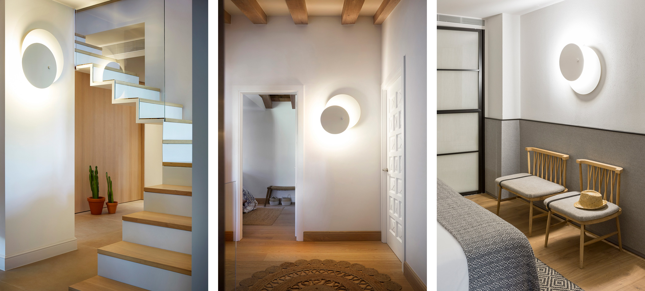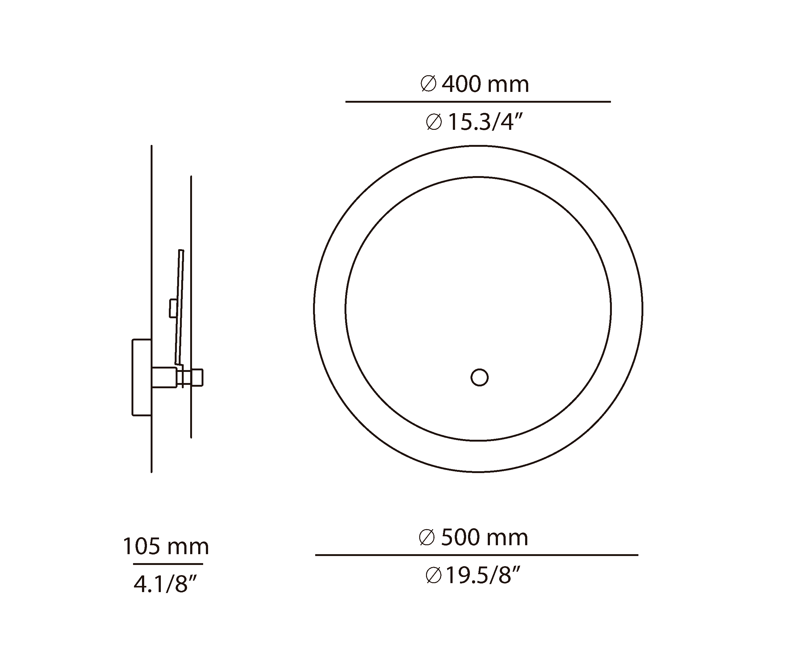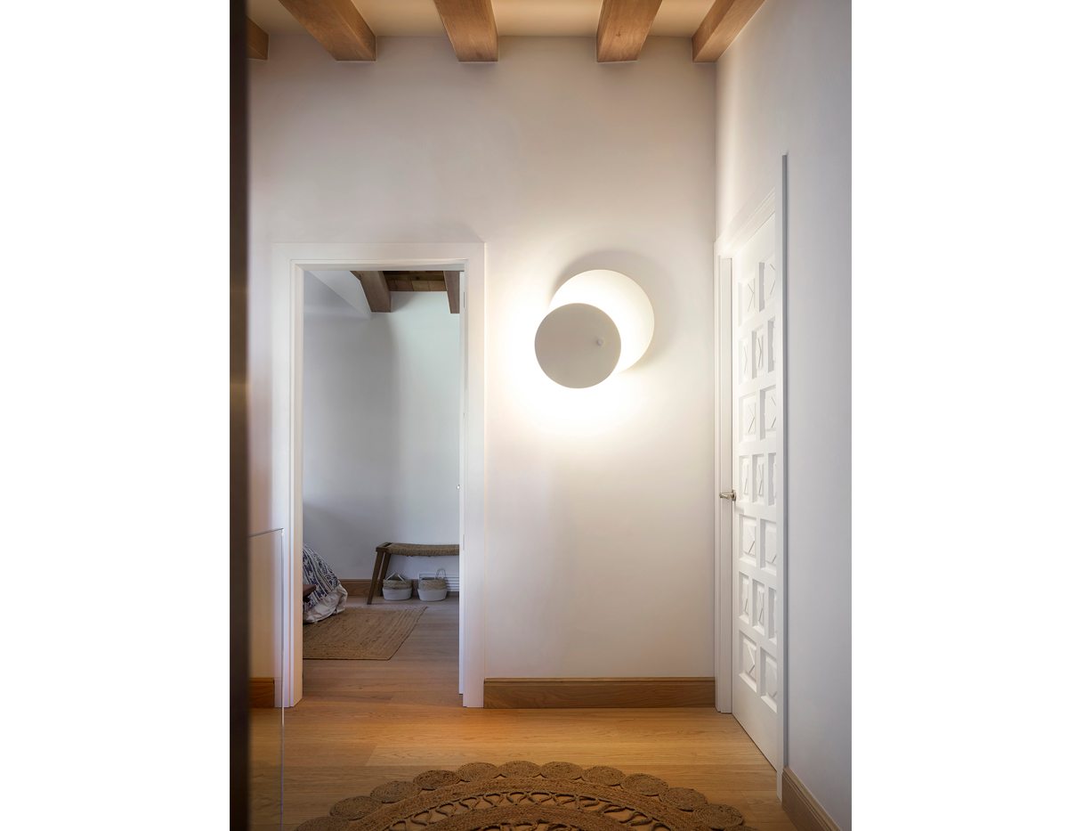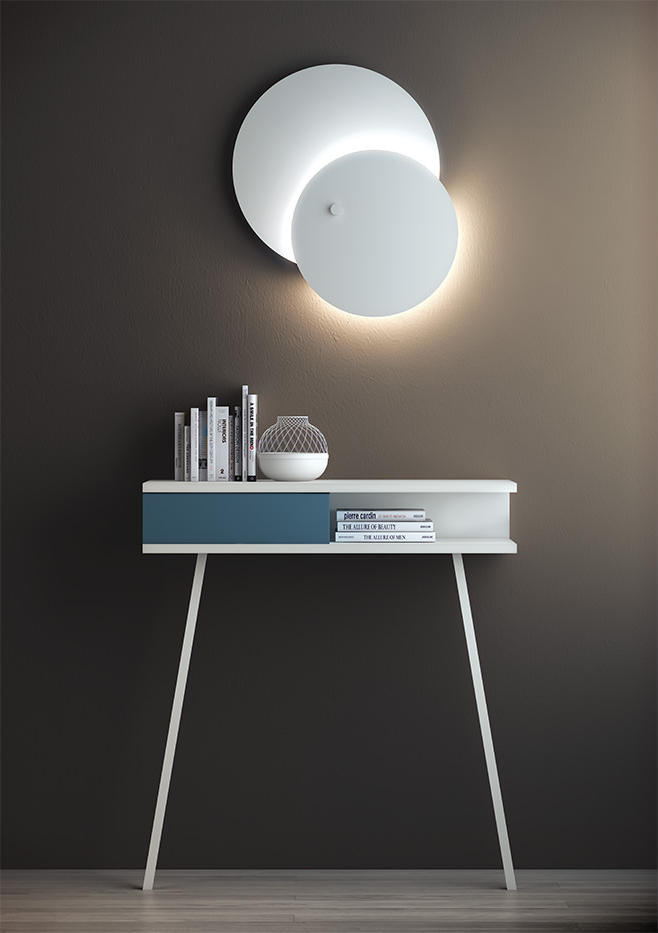 Metallic ceiling and wall lamp with a pivoting front plate and integrated LED providing indirect light.