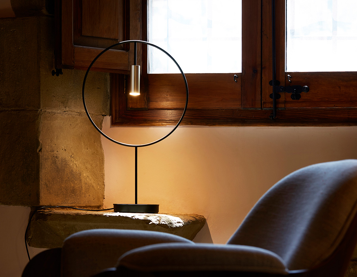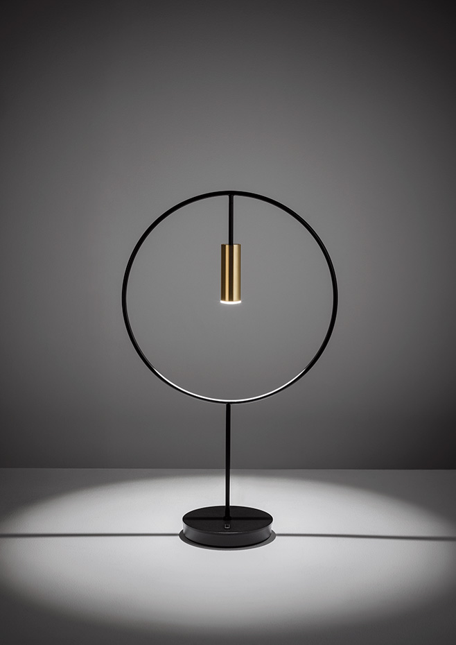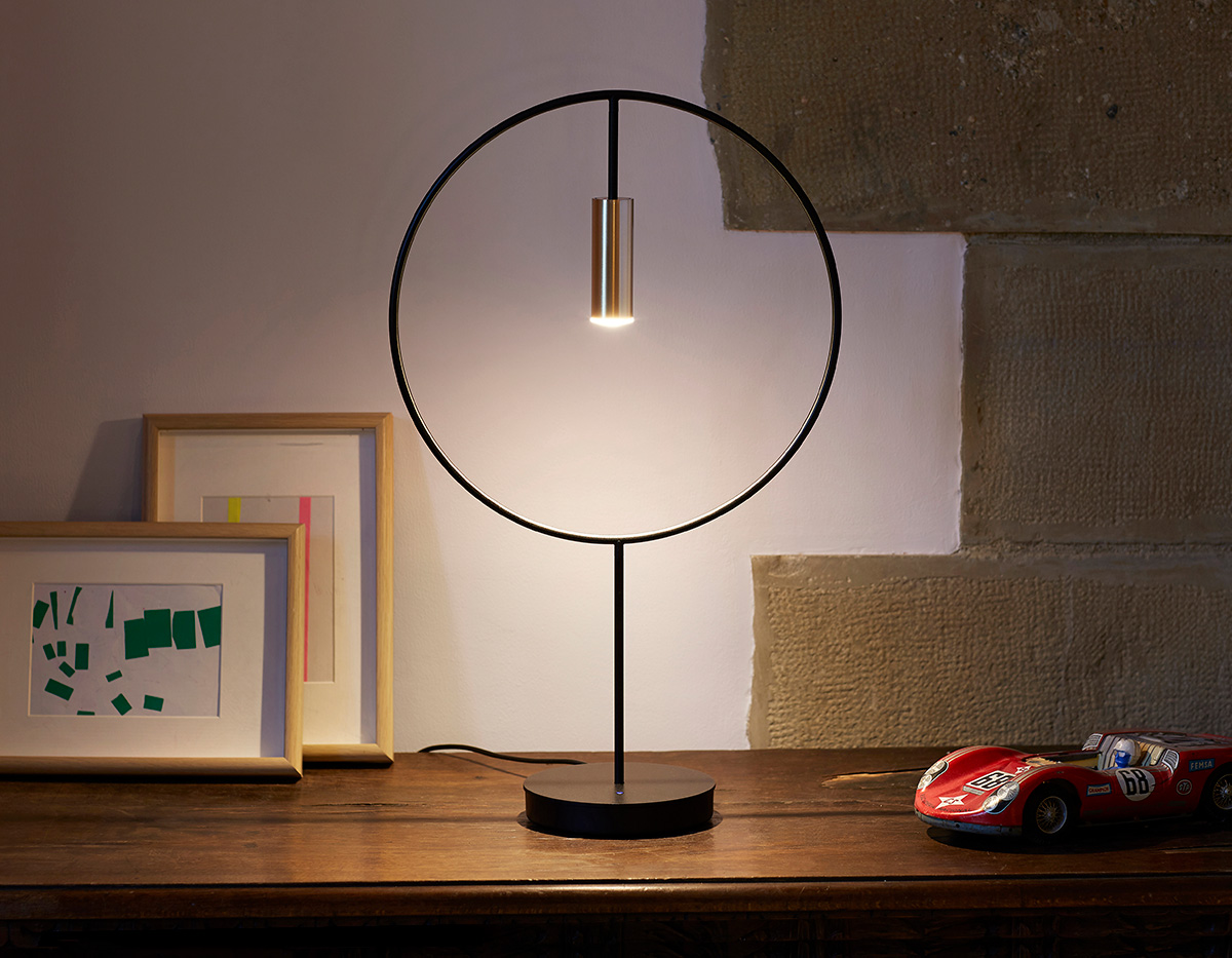 Table lamp with a circular body, cylindrical aluminium head and acrylic (PMMA) lens diffuser. Integrated sensor dimmable LED.