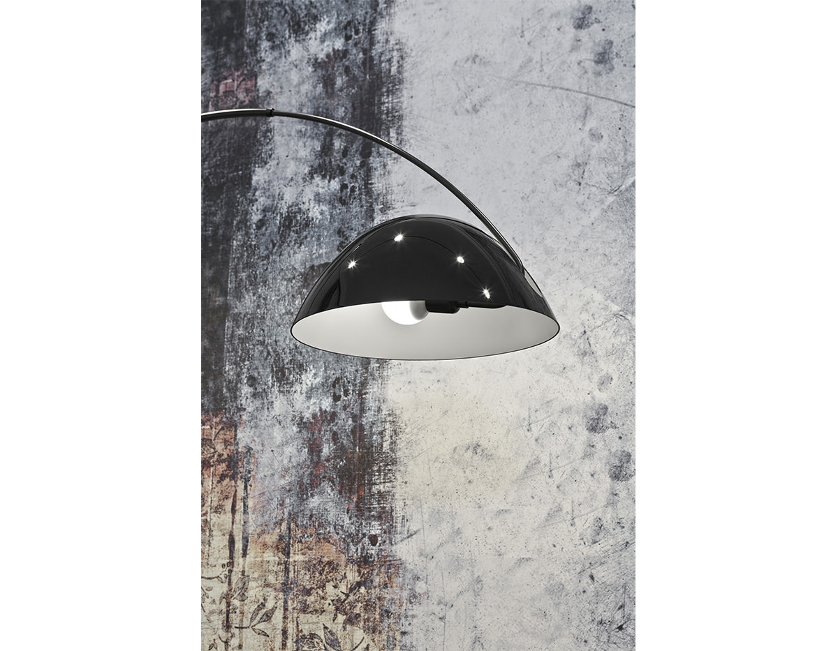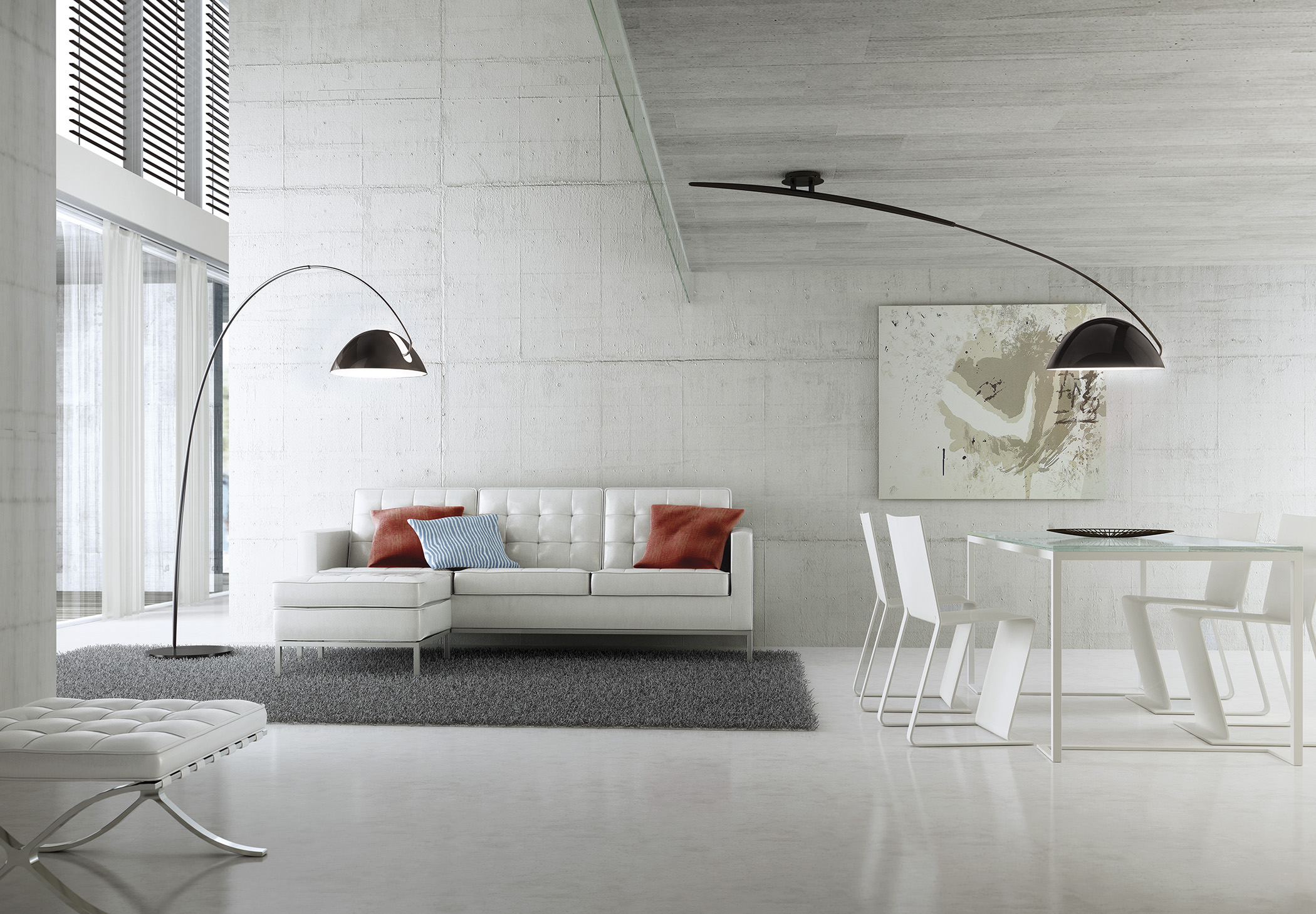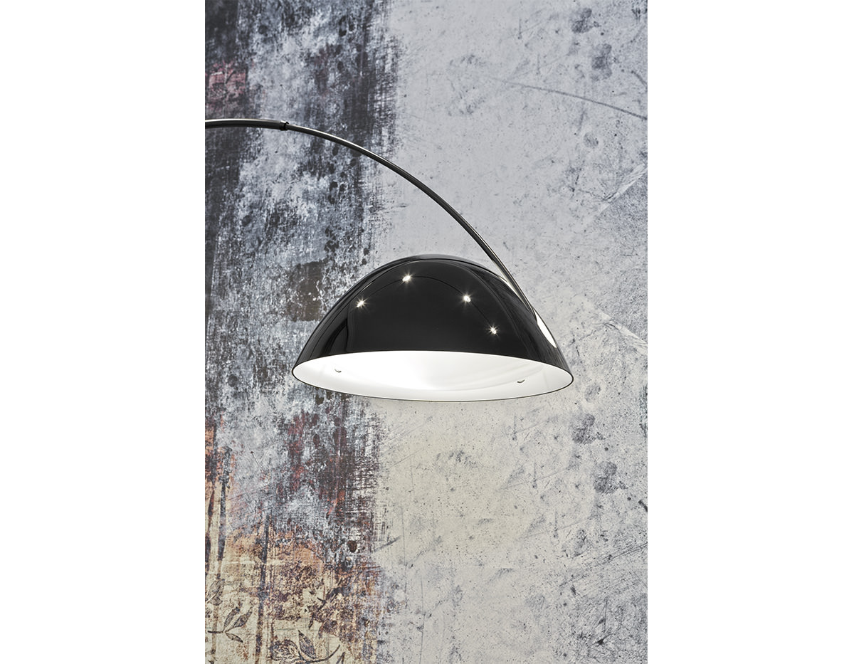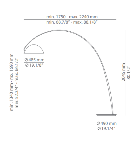 Metallic arc lamp with acrylic shade and extensible swing arm. Optional bottom methacrylate diffuser. Cord dimmer.