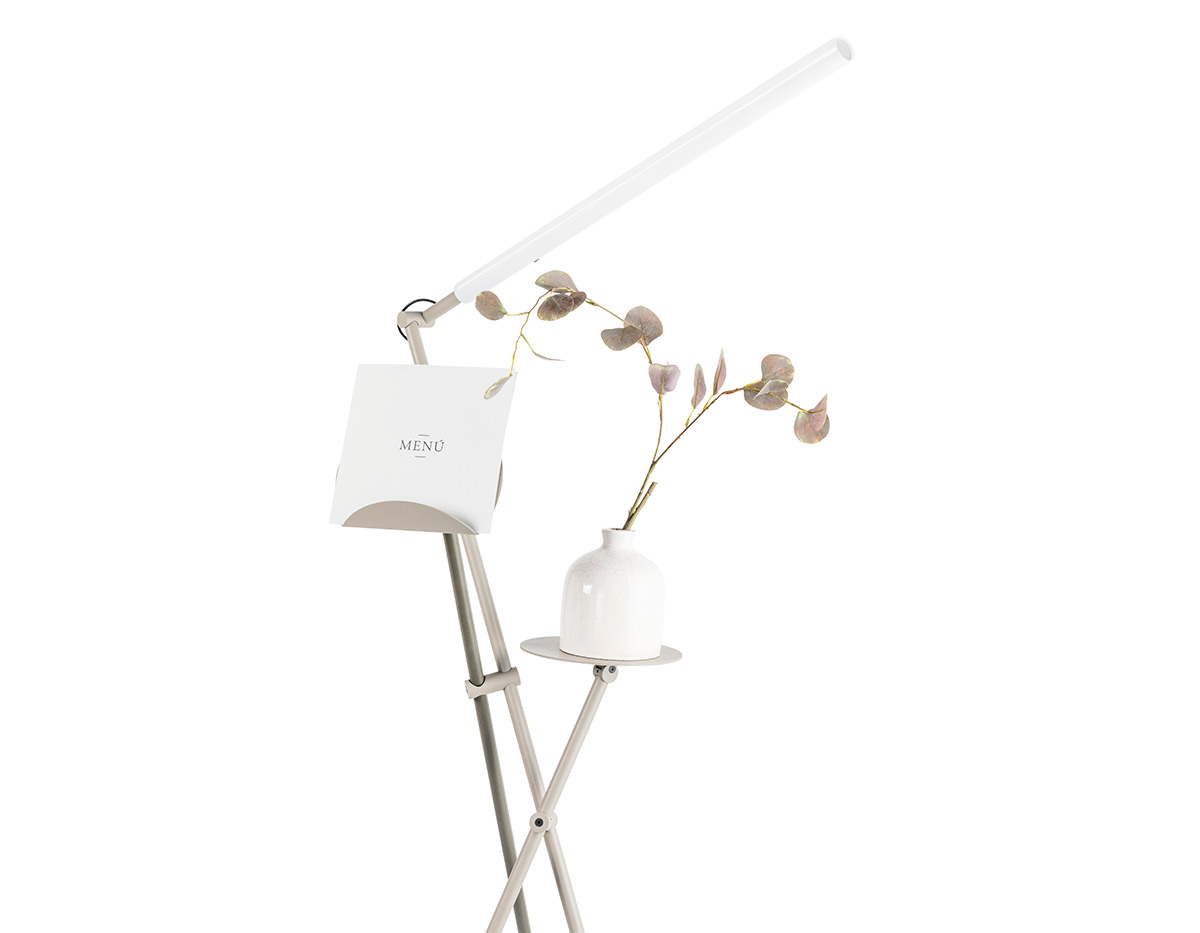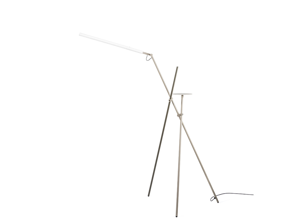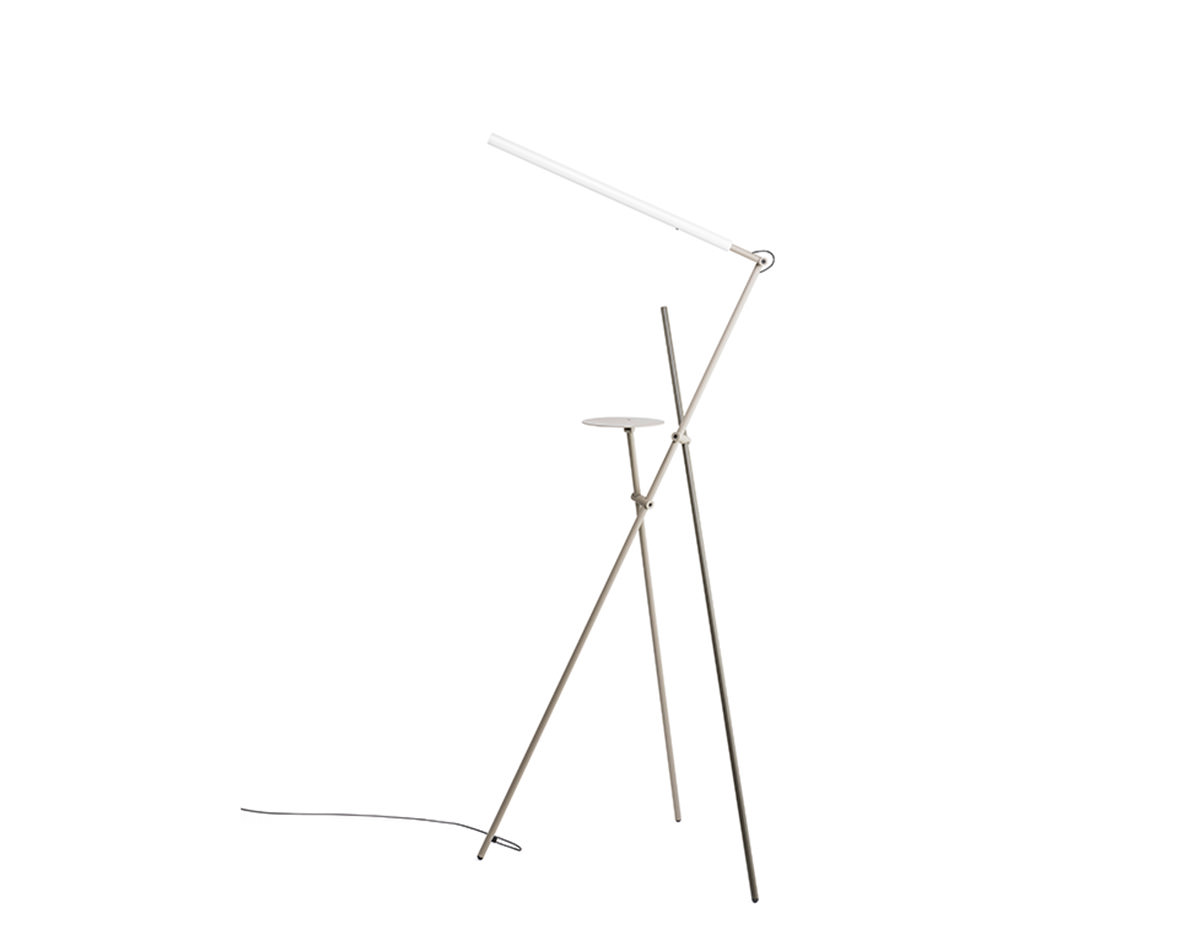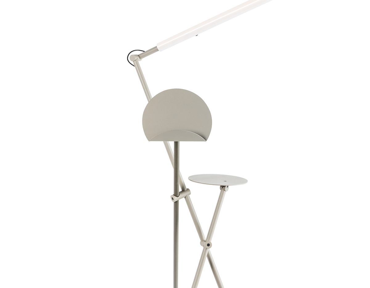 Metallic floor lamp with three multifunctional arms. Direct and indirect light provided by an adjustable arm with acrylic diffuser and integrated dimmable LED on the stem. Accessories can be added to the stems such as a table or magazine holder.