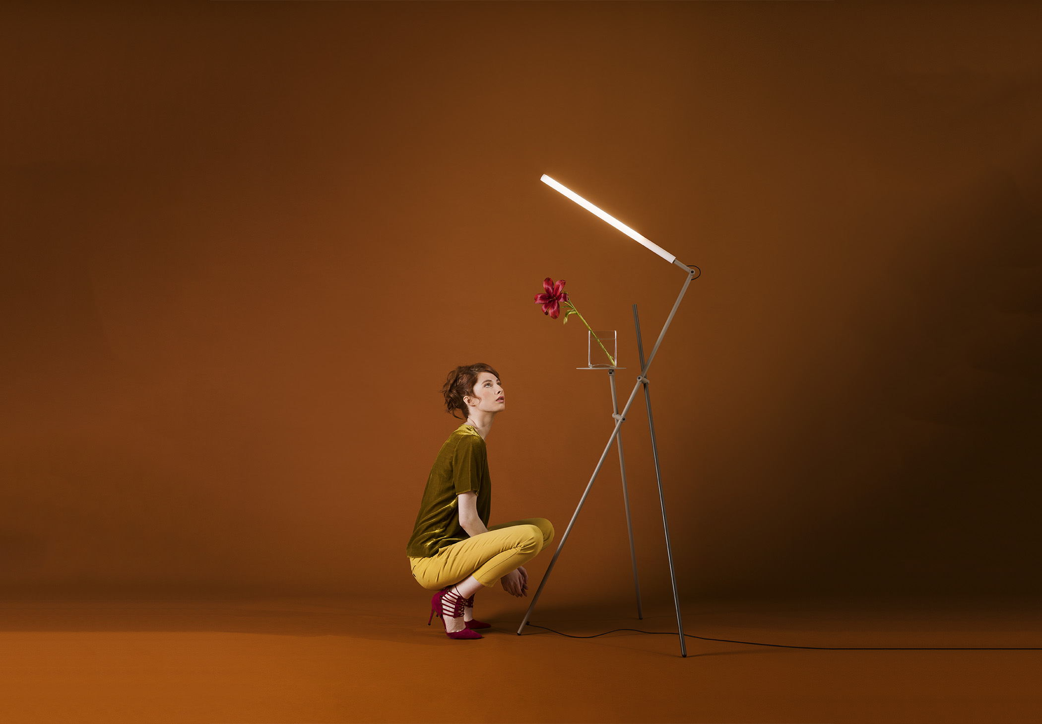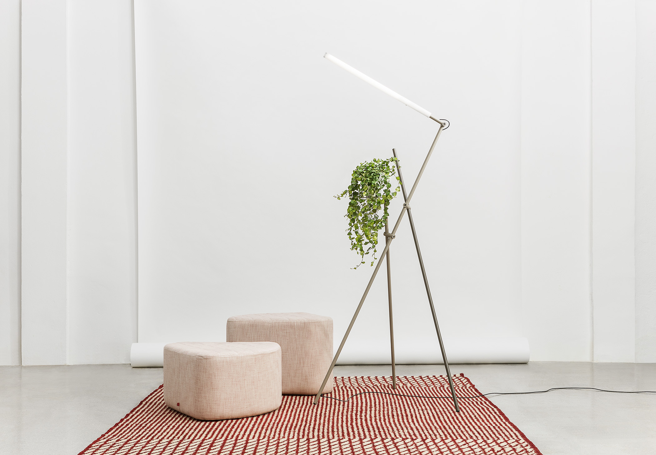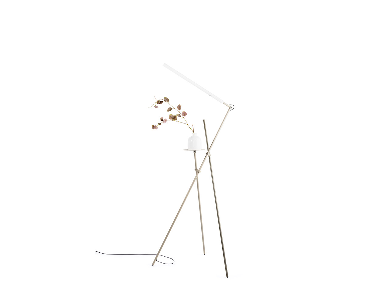 Metallic floor lamp with three multifunctional arms. Direct and indirect light provided by an adjustable arm with acrylic diffuser and integrated dimmable LED on the stem. Accessories can be added to the stems such as a table or magazine holder.