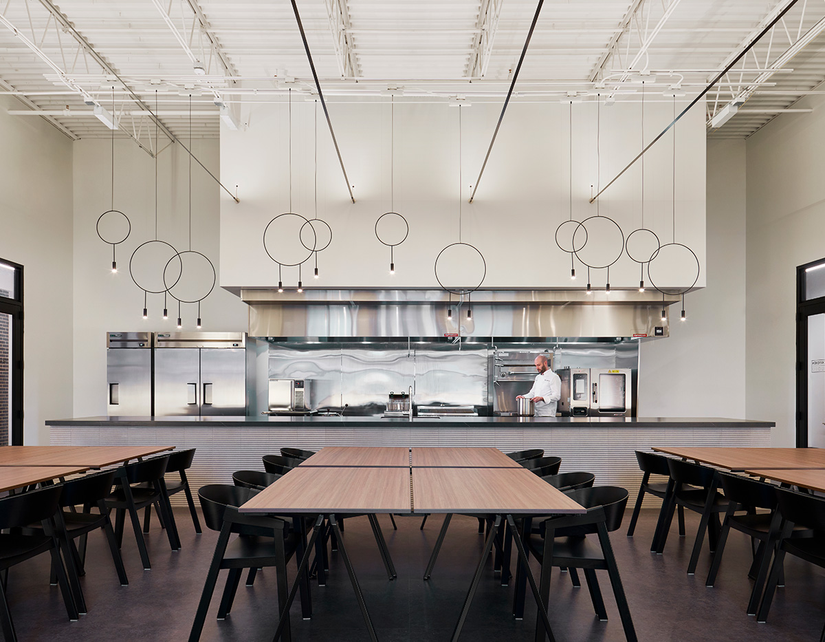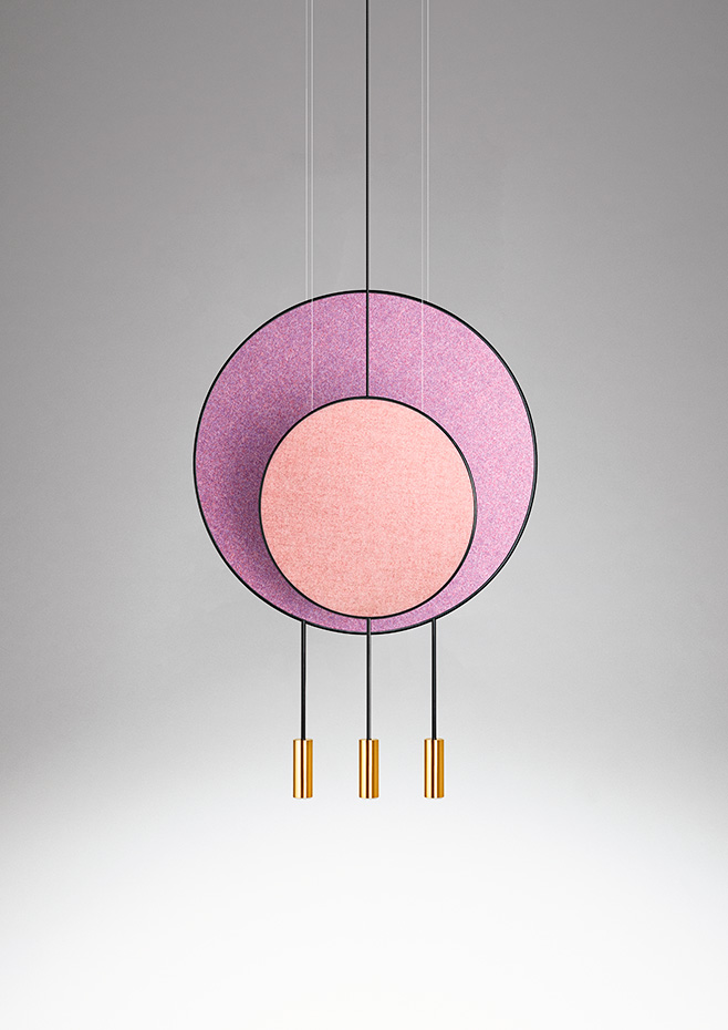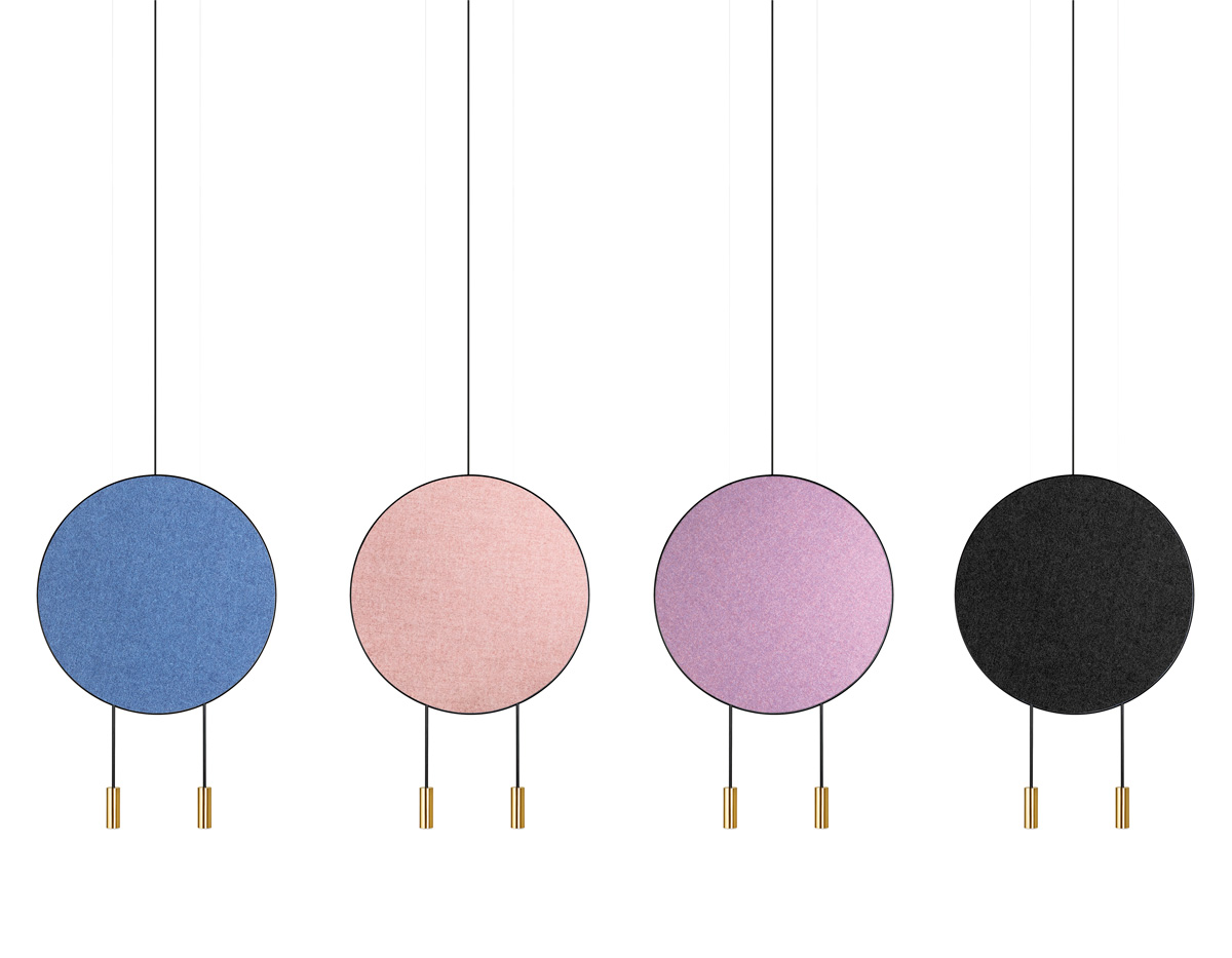 Cylindrical aluminium heads and acrylic (PMMA) lens diffusers. Adjustable height. Optional decorative sound absorbing panel.