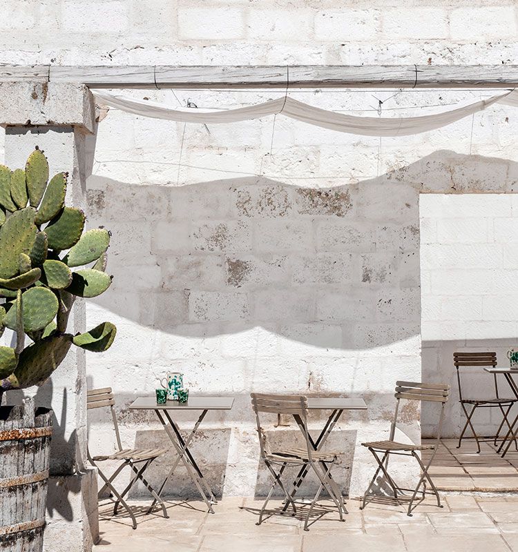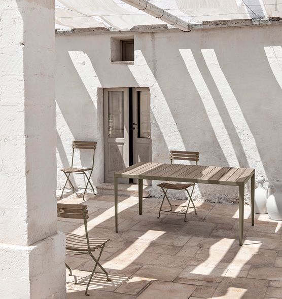 The essential lines of the Laren collection are enhanced by the material encounter between metal and teak.