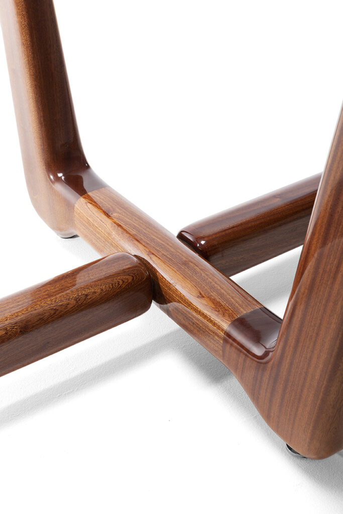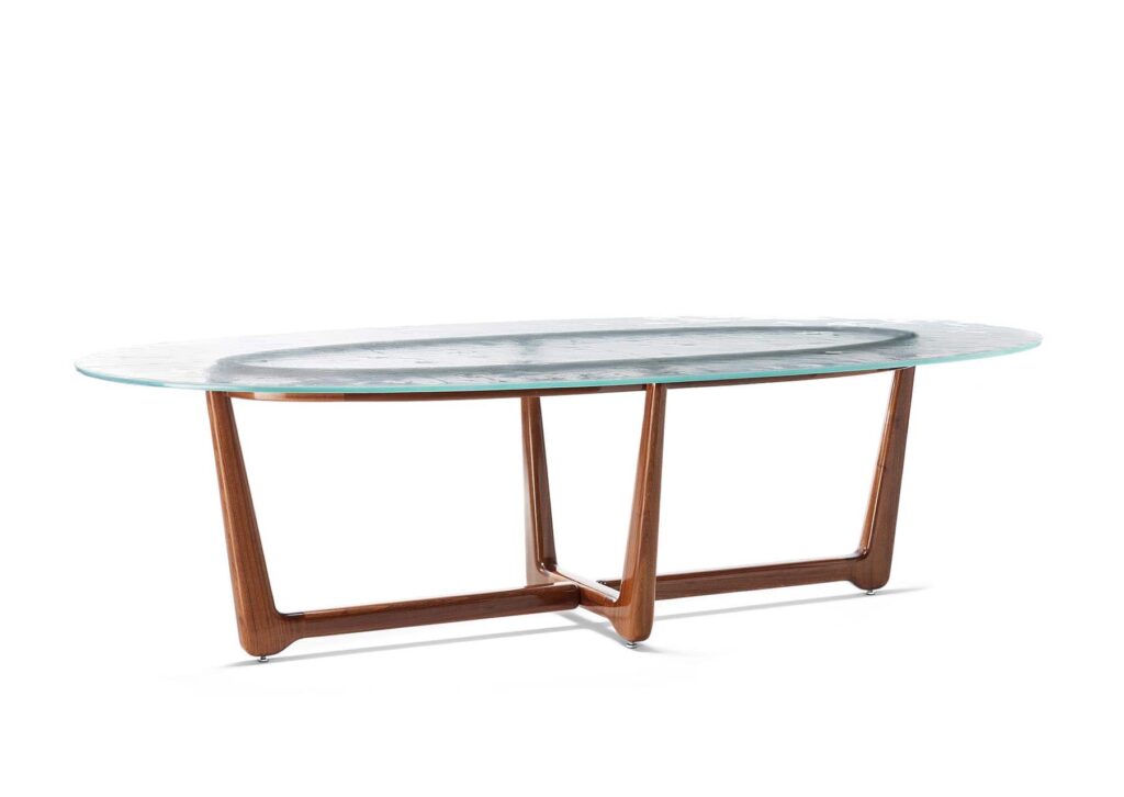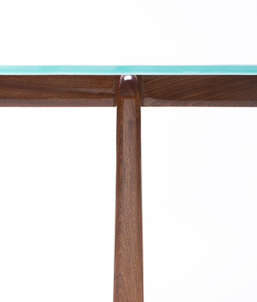 The translucent surface of the glass allows one to admire the sturdiness of the wooden base.