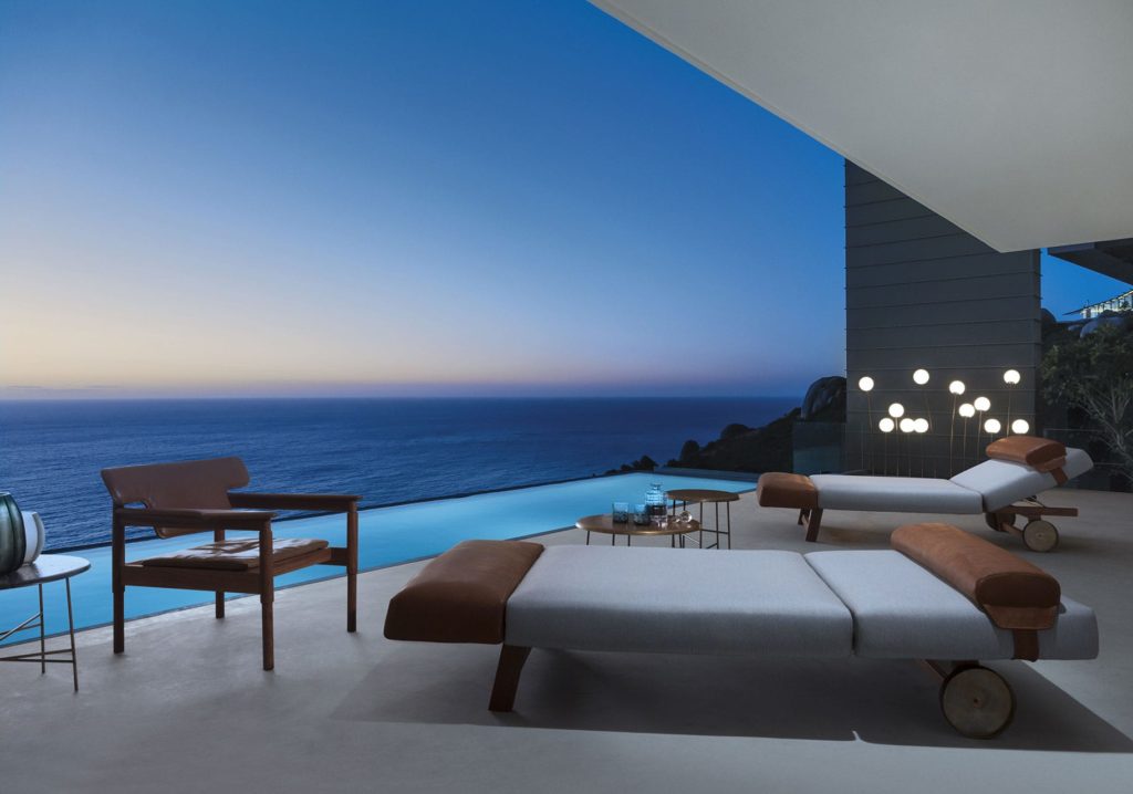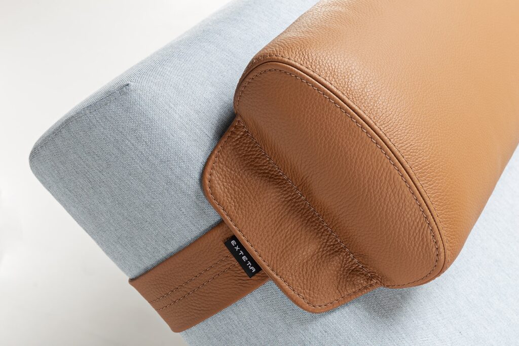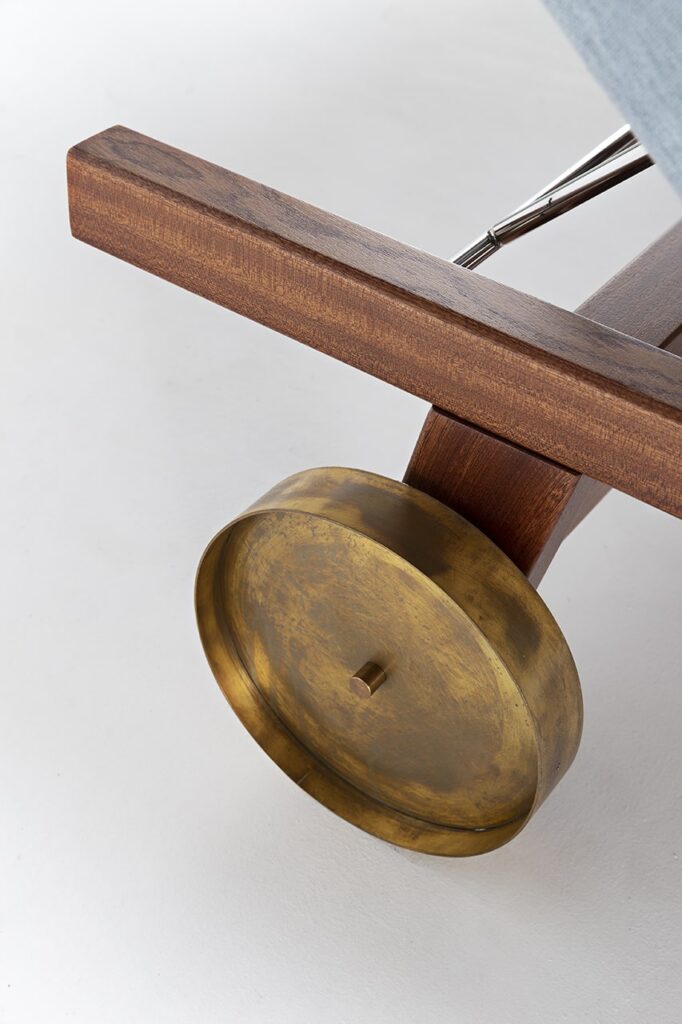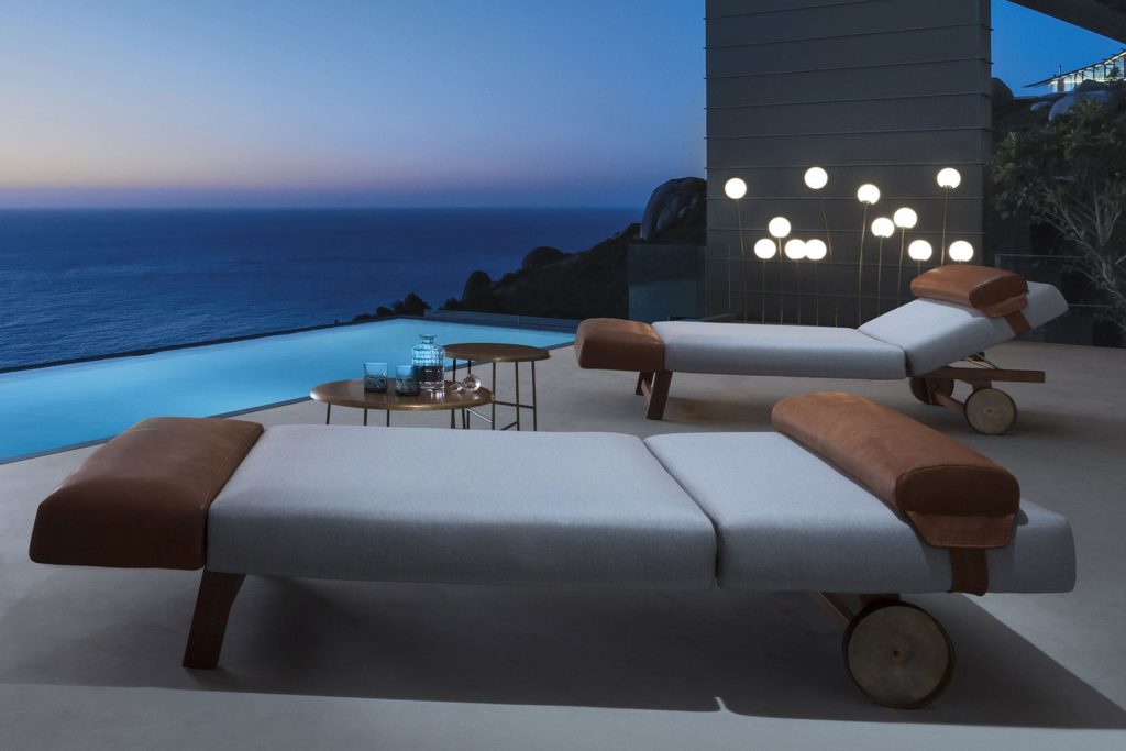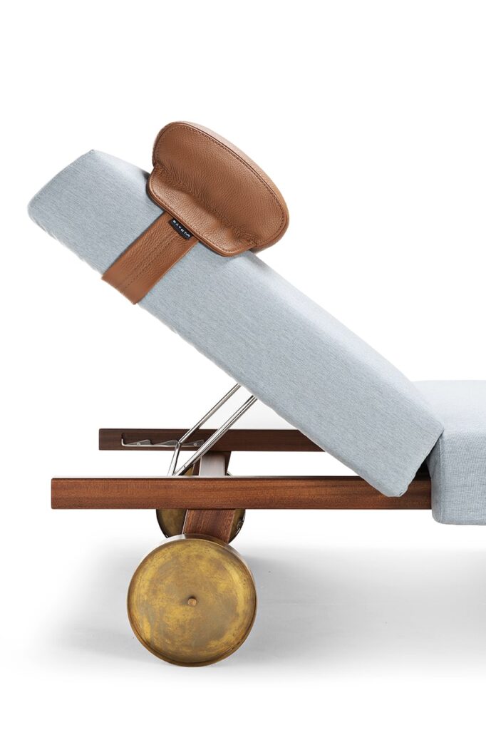 The seat, available in three soft modules, is supported by the Sapelli solid mahogany handmade frame. Equipped with burnished brass wheels that facilitate its movement, 10th Sun Longer is the sunbed that dresses every room with elegance. Available in fabric and leather for outdoor use.