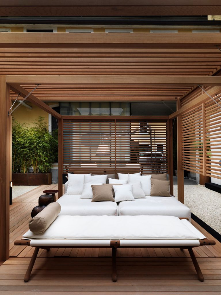 The frame of the elegant sunbed is handmade in solid Sapelli mahogany. Available in fabric and treated leather for outdoor use, it can be equipped with the soft "Comfort" cushion.