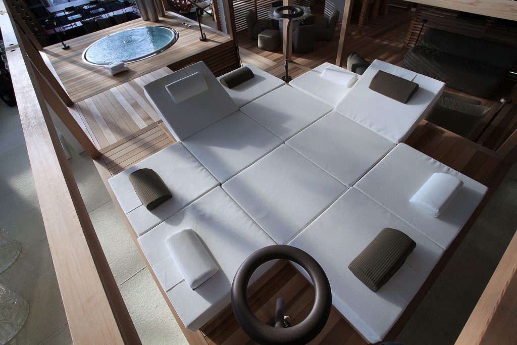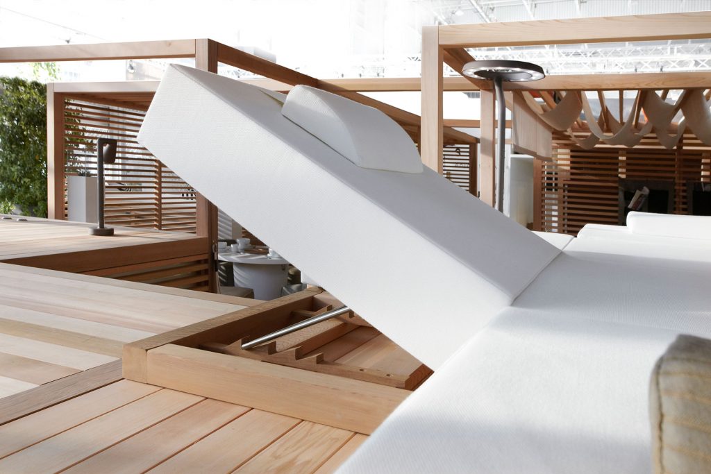 The adjustable system in solid Cedarwood from Canada accommodates the outdoor cushioning, with closed cell structure, made according to nautical principles, and upholstered in Sunbrella? nautical fabric, removable and washable. To enjoy a wellness experience shaped according to your own space.