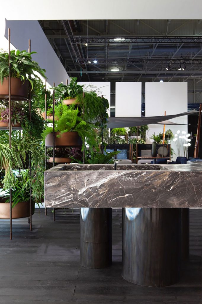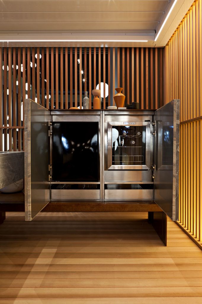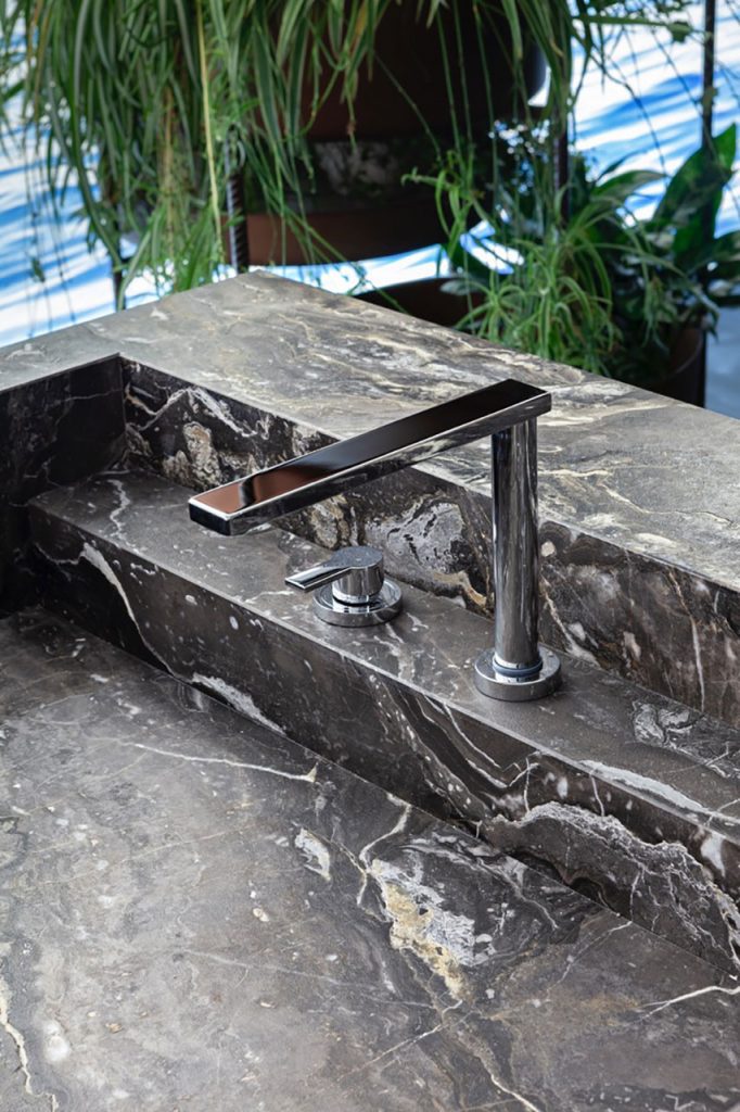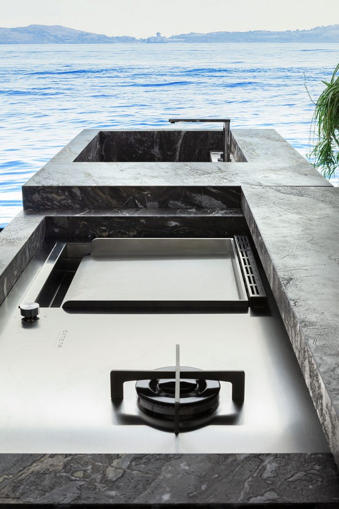 The natural marble grain makes each slab a unique aesthetic experience, in addition to its easy maintenance and functional ability to resist in the outdoors. The top is composed of minimal lines, supported by hand-etched iron legs, in perfect balance with an evocative setting. What results is a combination of noble and natural materials that elevates the aesthetics of gardens and terraces. The island offers mobility and enjoyment while immersed in the open air surroundings.