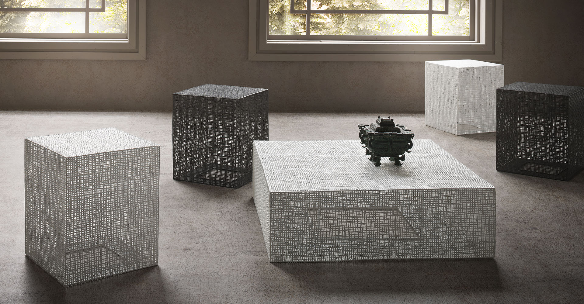 A light weave skillfully woven by the hands of skilled craftsmen. Thin, pressed, braided and varnished iron wires become warping in a game of transparency of solids and voids, a unique feature of these tables.