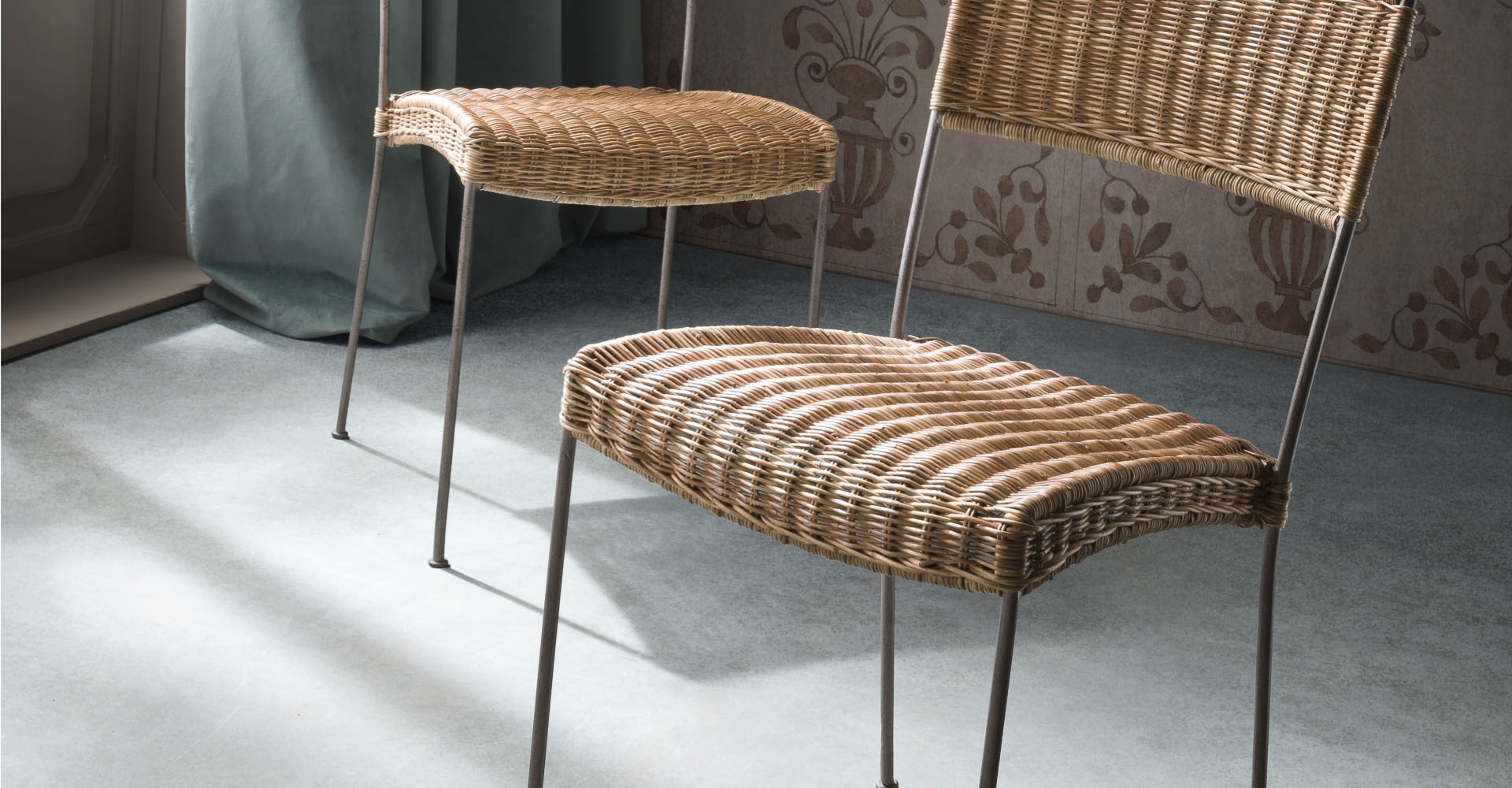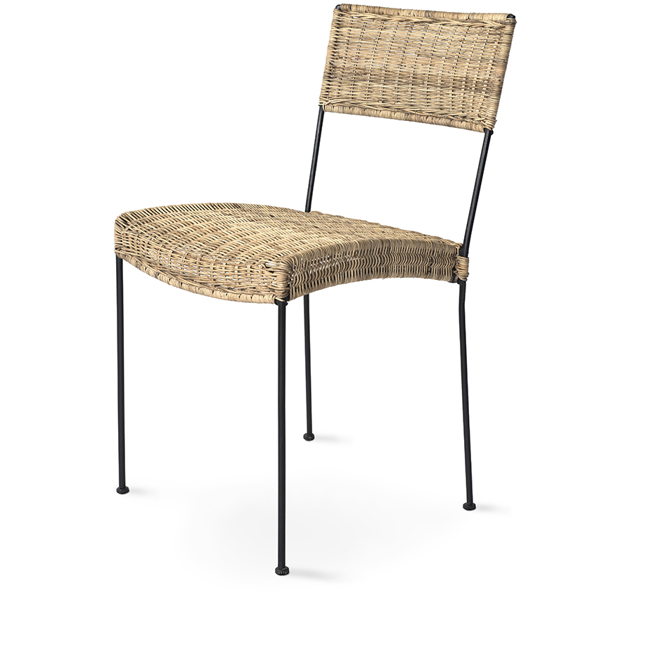 Evoking the image of a French terrace or a patio in Tuscany, this chair has a classic design reinterpreted with a metal frame and woven bamboo details. Light and limber, the slim, cylindrical legs support the generous seat, whose curves enhance the elegant pattern of the woven bamboo. The tall backrest provides functional support and visual balance to this genuine yet refined at the sam time chair that makes a welcome addition to any living room, kitchen, or patio decor.