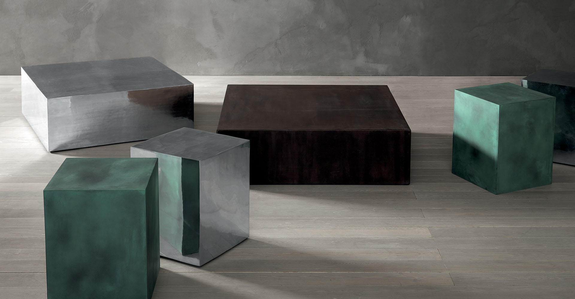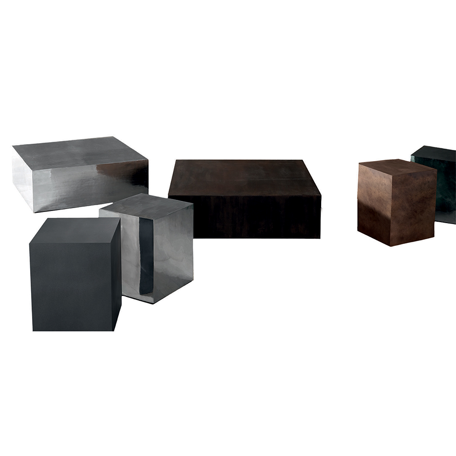 The simplicity of the cubic shape of the AL table or stool results from the meeting of the edges of a laser-cut sheet metal, in which the mirrored symmetries of satin-finish, diamond-coated or etched metallic paint come to life making it a surprisingly light element.