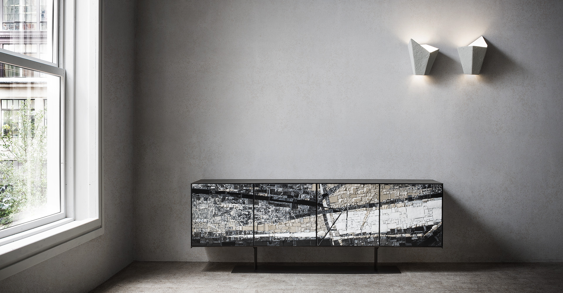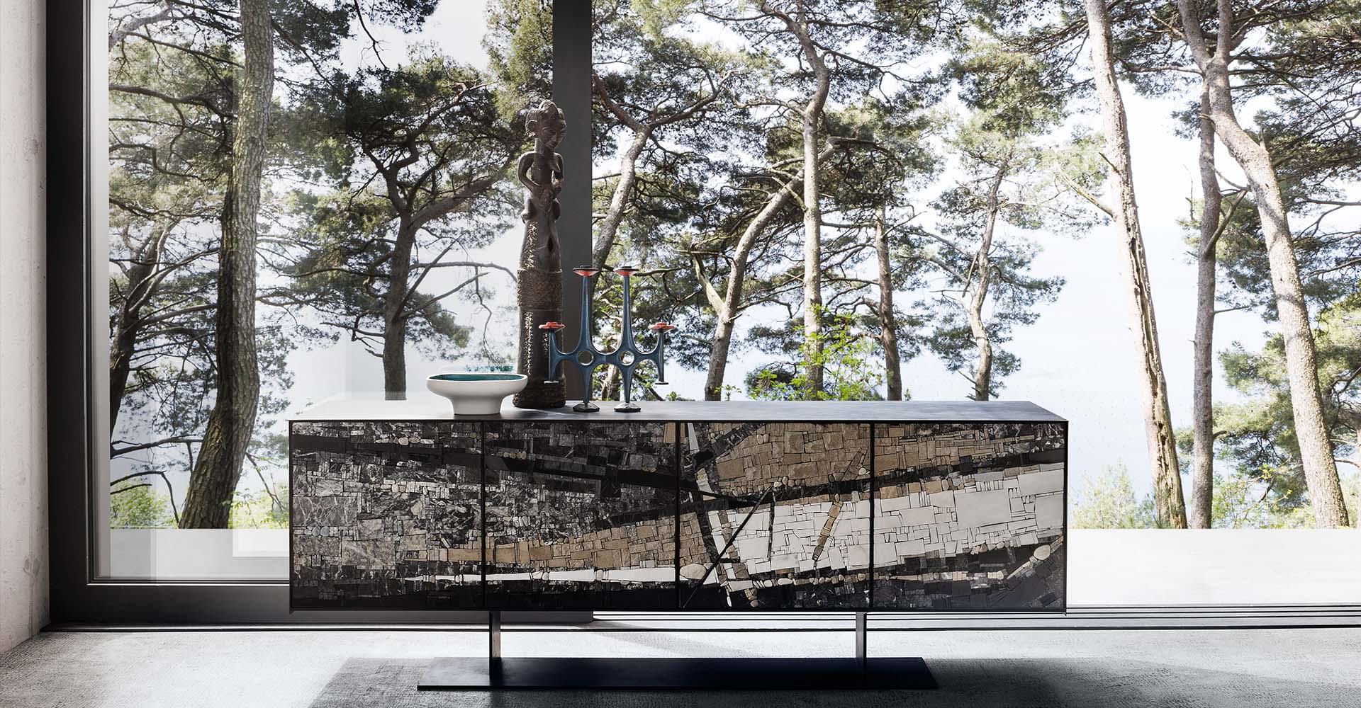 Semplicità e lucentezza caratterizzano questa madia dal fascino ipnotico, che presenta una struttura rettangolare e la base minimale in metallo, con quattro ante disponibili nelle preziose varianti Mosaico Exclusive, Mosaico Terra, Terrazzo Veneziano o Argilla e un interno in impiallacciato noce canaletto con ripiani in vetro extrachiaro. I Mosaici sono provenienti dalla famosa scuola internazionale Mosaicisti del Friuli di Spilimbergo. I soggetti rappresentati sono particolari tratti da noti capolavori artistici. Il terrazzo veneziano deriva dalla tecnica originale usata nella pavimentazione spesso usata nei palazzi veneziani, che già nell’antica Grecia veniva utilizzata nei rivestimenti di pavimenti e pareti. I rivestimenti in argilla sono realizzati con pura argilla e resine leganti.