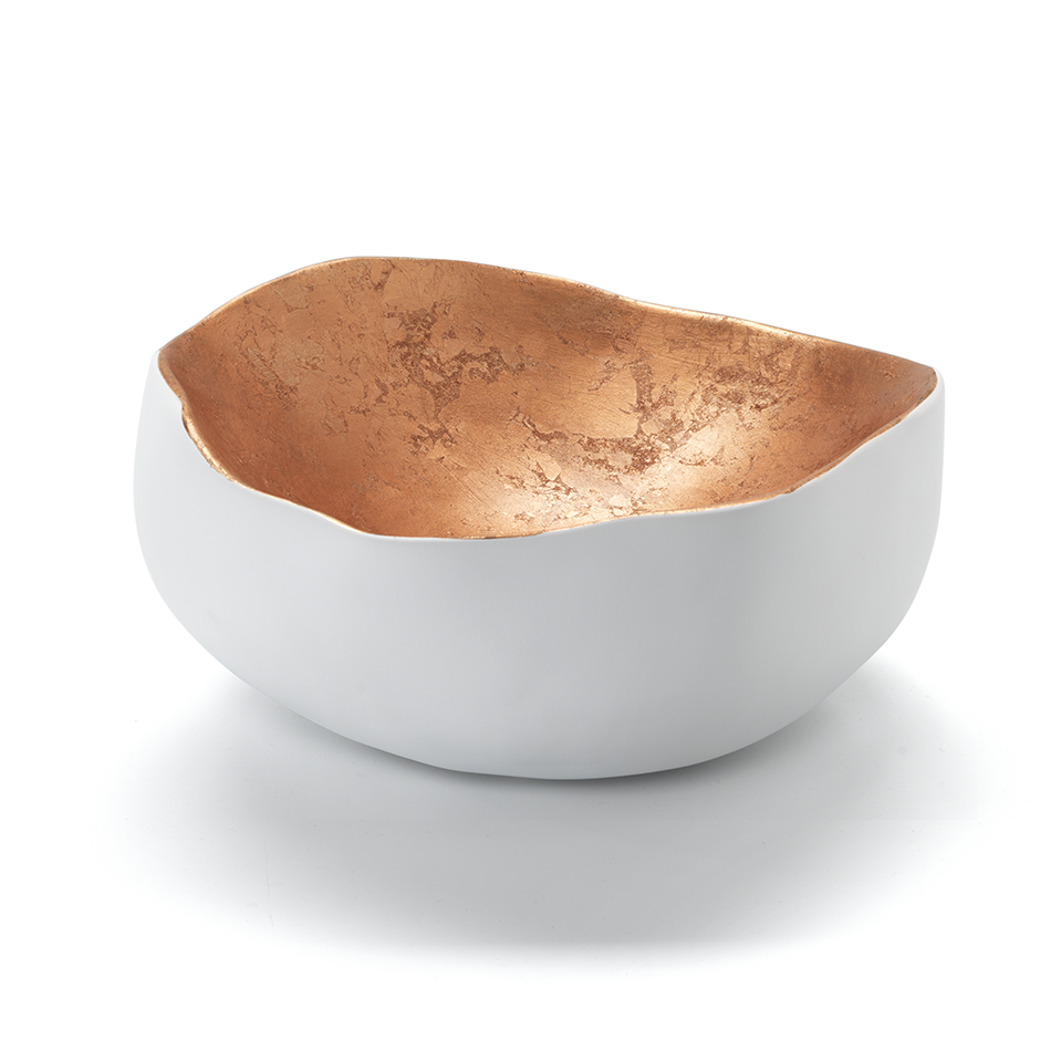 ll contrasto di colori e texture tra l'interno bianco, cemento o bronzo e l'esterno in smalto opaco bianco dà vita ad un oggetto dall'interessante contrasto tattile e visivo. La ruvidità o la lucentezza espresse dalle finiture e la sagomatura irregolare fanno sembrare questa ciotola la sezione di una pietra che cela al suo interno un prezioso minerale.