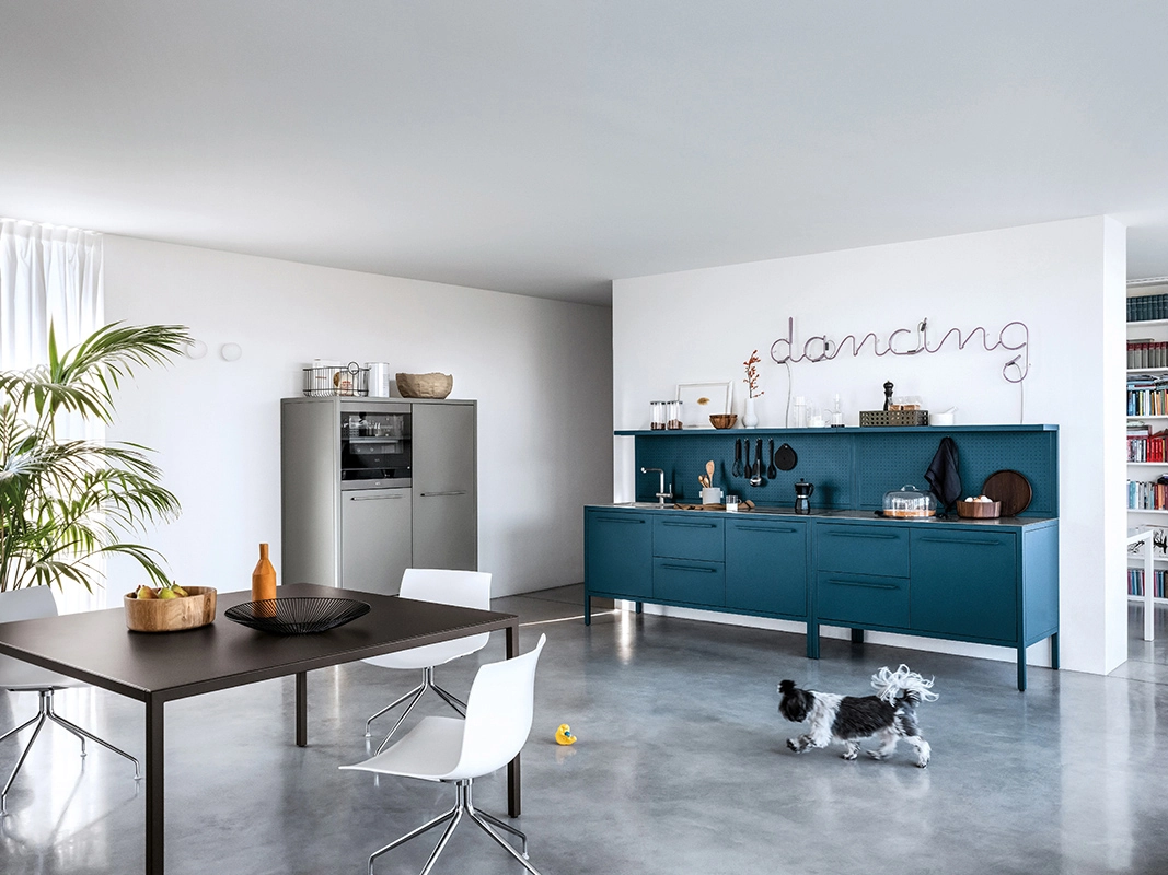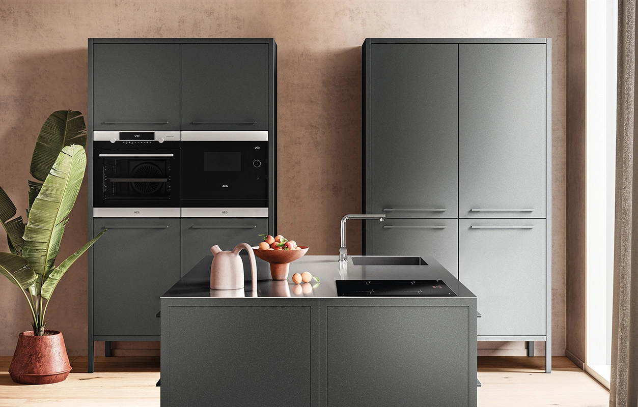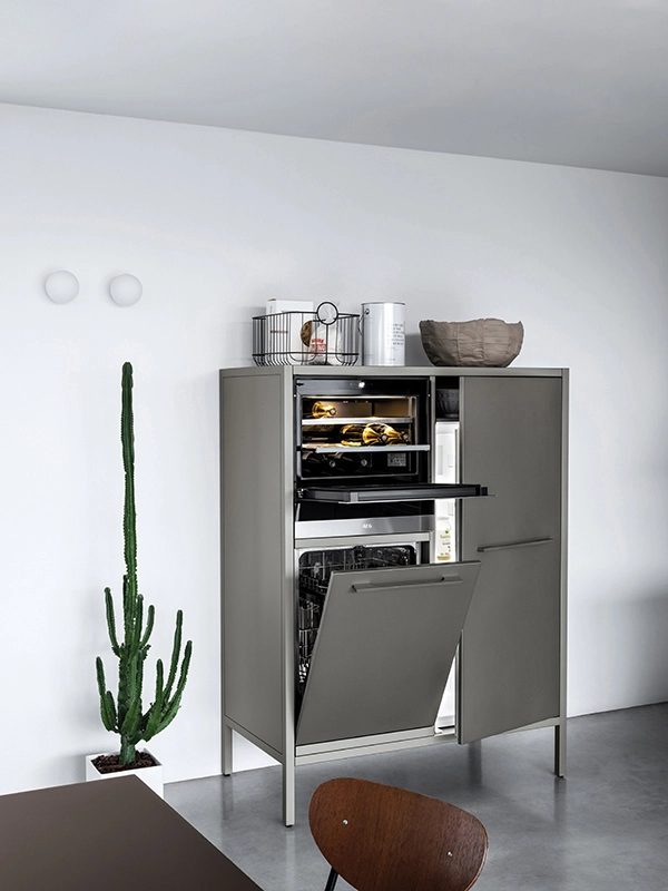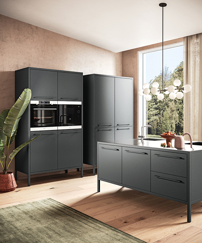 Le colonne Frame sono proposte in due altezze e possono essere dotate di ante ed elettrodomestici, senza limiti compositivi. La sorprendente palette cromatica, composta da 47 finiture, consente di personalizzare il prodotto adattandolo a ogni ambiente.